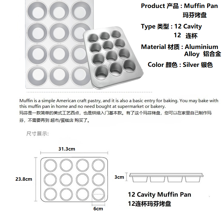 - 12 Cups / Cavity in 1 tray 1个烤盘有12个杯子