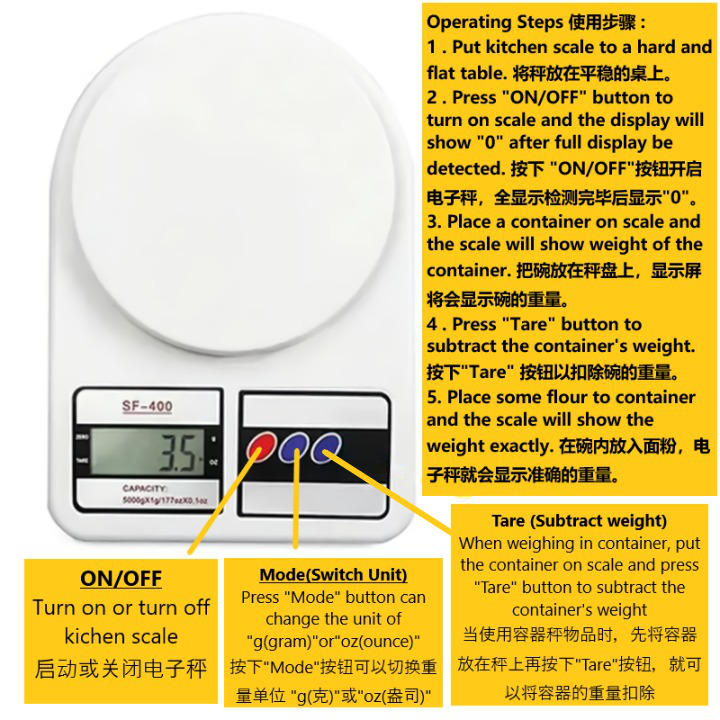 When weighing with container, put the container on the scale first, the display will show the container's weight . Then, press "Tare" to substract weight of container, when display show "0" , put item into container and the display will show the item's weight. 当使用容器秤重物品时,先将容器放在秤上,显示屏会显示容器的重量,按一下"Tare"按钮,等显示屏写"0"时,再倒入想要秤的物品就可以得到物品的净重量。