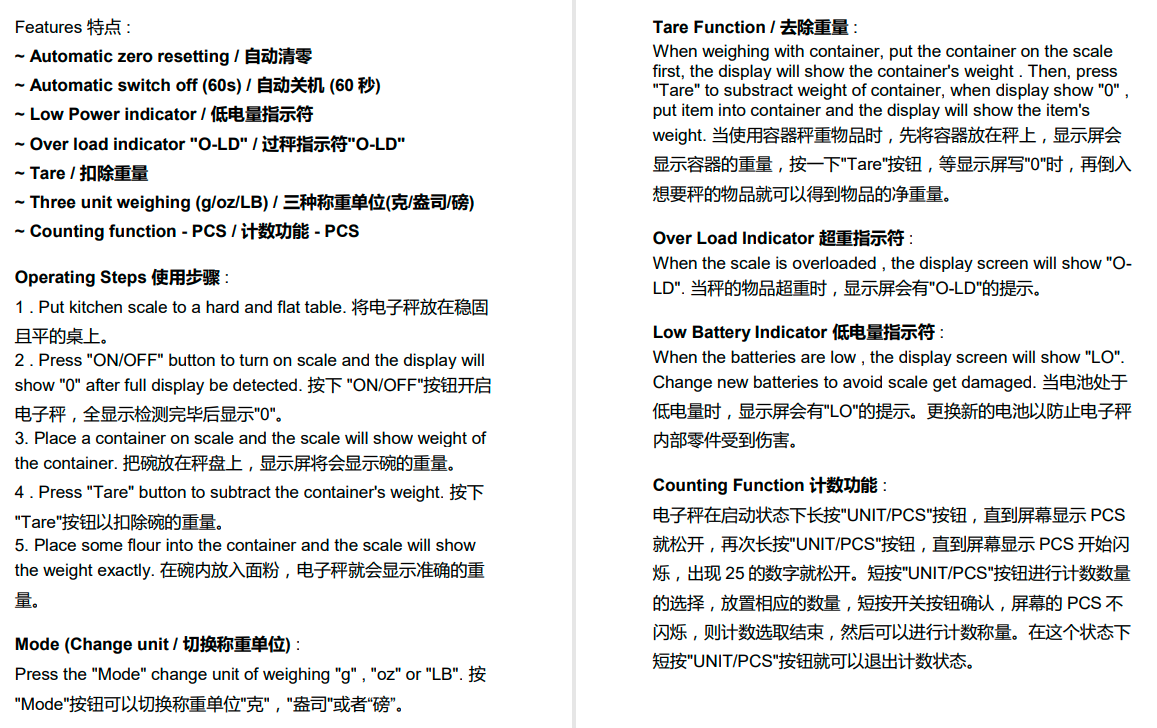 When weighing with container, put the container on the scale first, the display will show the container's weight . Then, press "Tare" to substract weight of container, when display show "0" , put item into container and the display will show the item's weight. 当使用容器秤重物品时,先将容器放在秤上,显示屏会显示容器的重量,按一下"Tare"按钮,等显示屏写"0"时,再倒入想要秤的物品就可以得到物品的净重量。