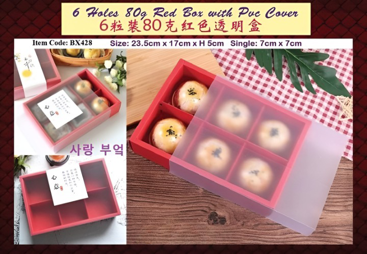 Product Name 产品名称 : 6 Cavity 80g Red Box With PVC Cover - BX428 6粒装80克红色透明月饼礼盒