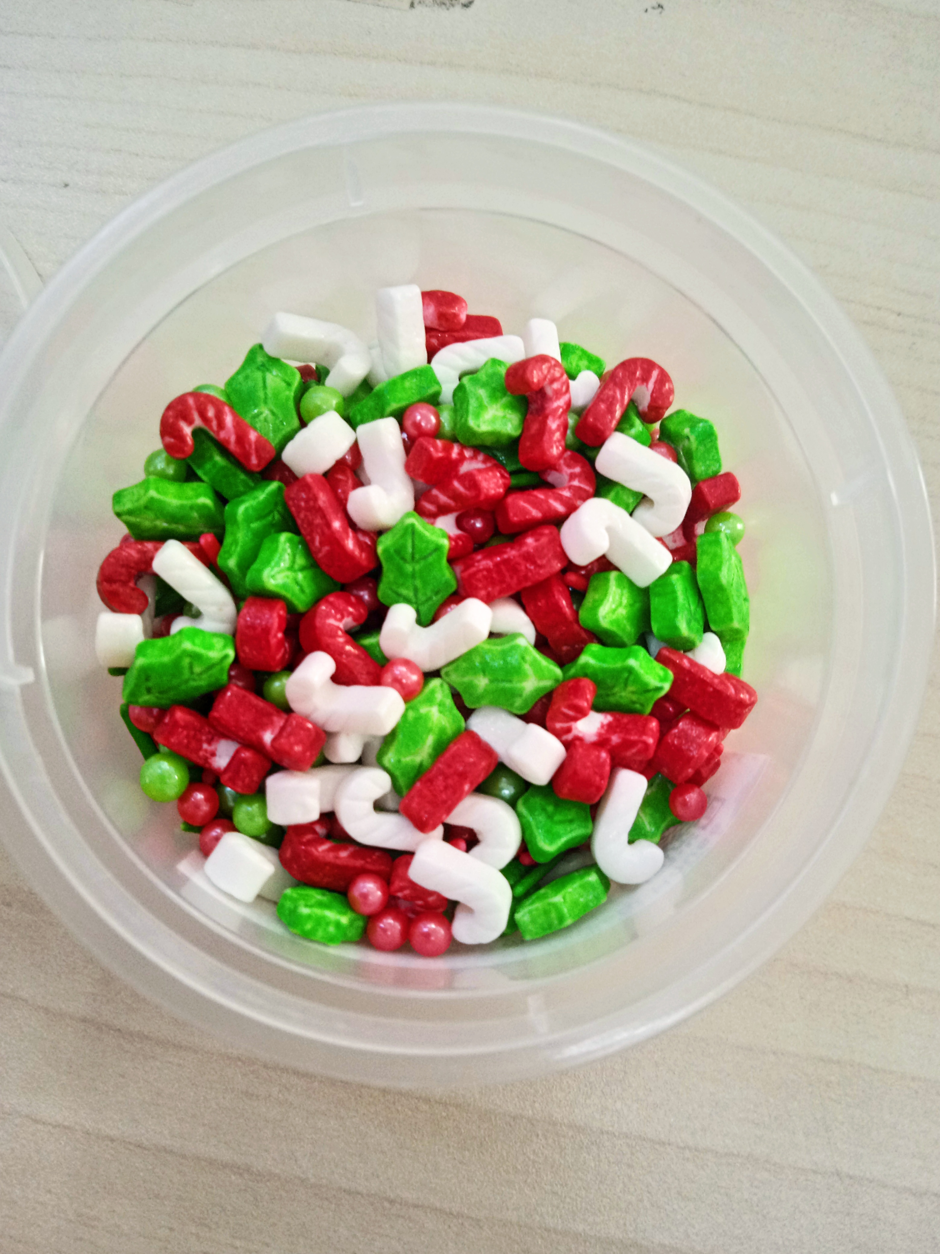 White Candy Cane 白色糖果手杖, Red Candy Cane 红色糖果手杖, Green Leaf 绿色叶子, Green Dragee 绿色小糖粒, Red Dragee 红色小糖粒, Red Rice 红色米形状糖装饰, Green Rice Shape 绿色米形状糖装饰, same as picture as shown 如图所示