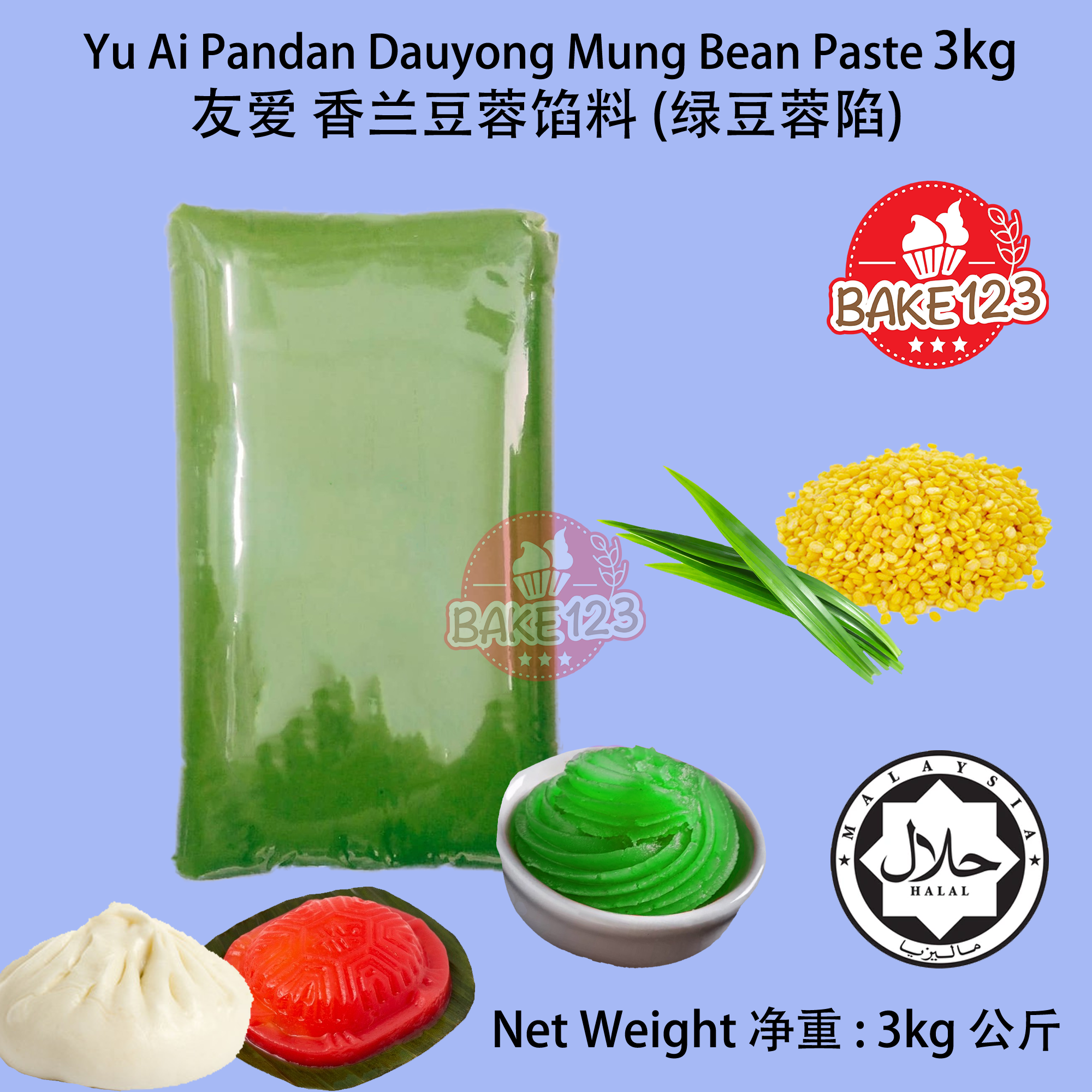 Product Name 产品名字: Yu Ai Pandan Dauyong / Pandan Mung Bean Paste 3kg 友爱 香兰豆蓉 / 班兰绿豆馅 3公斤