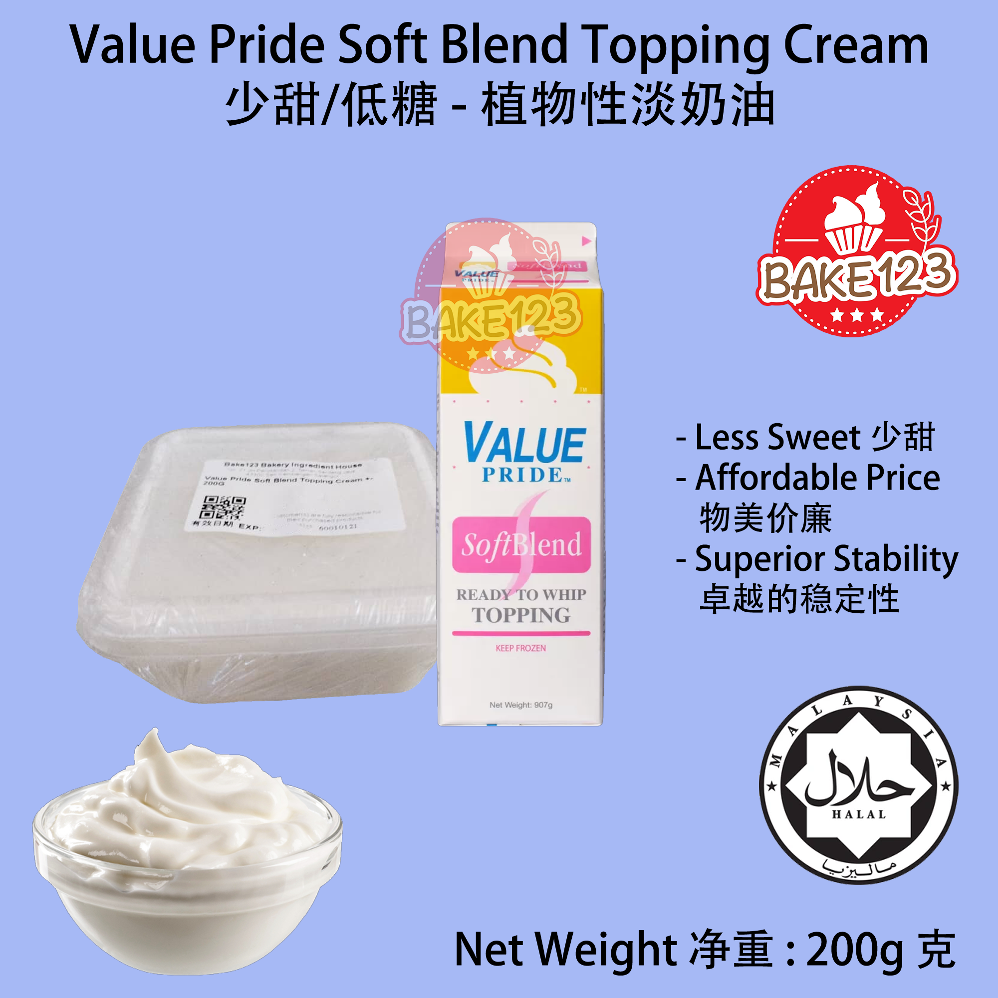 Product Name 产品名字: (Repack) Value Pride Soft Blend Non-Dairy Topping Cream 200g (散装) 少甜植物性鲜奶油 200克