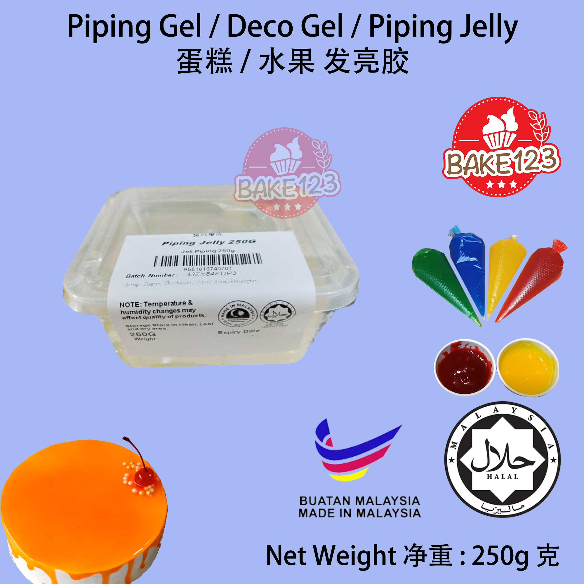 - Versatile Piping Gel 万能的装饰明胶: Piping Deco Gel by Bake123 is a versatile gel that can be used for both mirror glaze and fruit glazing. It adds a glossy finish to your desserts, making them visually appealing. Bake123 的 Piping Deco Gel 是一种多功能明胶,可用于镜面淋饰和果冻淋饰。它为您的甜点增添了光泽,使其在视觉上更吸引人。