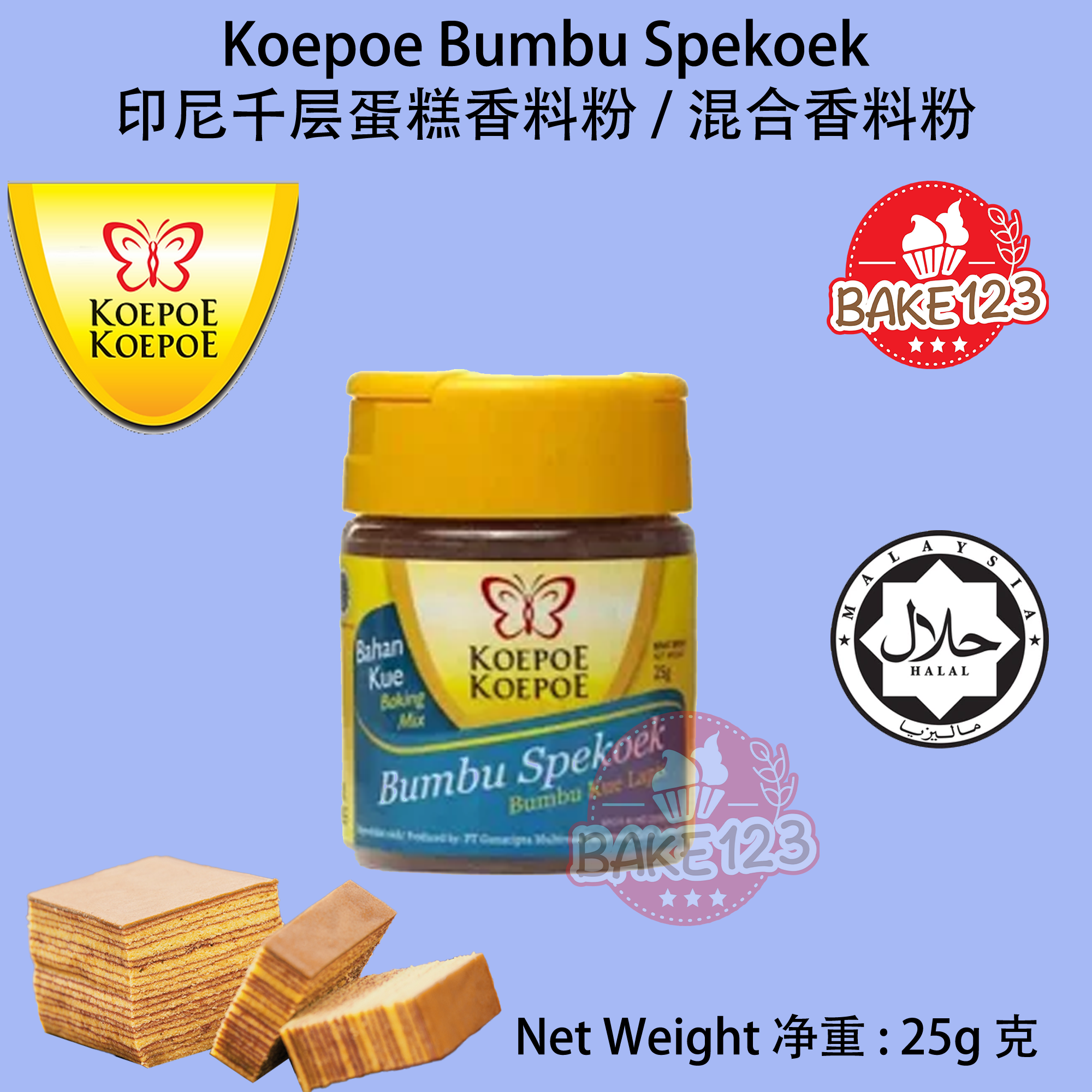 - Authentic Spice Blend 真正的香料混合: Koepoe-Koepoe Bumbu Spekoek Powder is an authentic spice blend that adds traditional and aromatic flavors to your Kuih Lapis. Crafted with care, this powder enhances the taste of your layered cake, making it a delightful treat for your taste buds. Koepoe-Koepoe 香料粉是一种真正的香料混合,为您的千层糕增添传统和芳香的味道。精心制作的这种香料粉提升了您的千层蛋糕的口感,为您的味蕾带来了美味的享受。