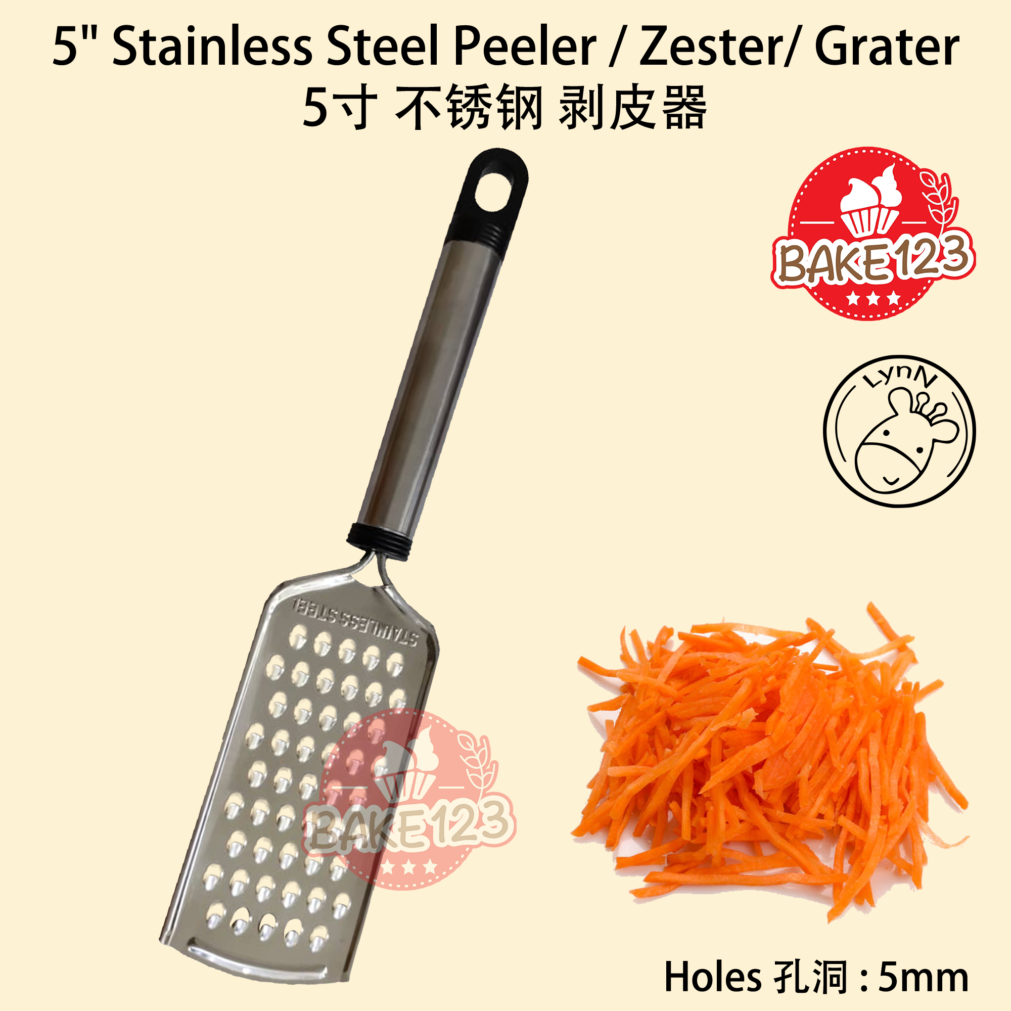 Features 特点 : - Durable Stainless Steel Construction 耐用的不锈钢结构 : Crafted from high-quality stainless steel, this grater ensures durability and longevity. The sturdy construction makes it suitable for grating various ingredients in your kitchen. 采用优质不锈钢制成,这个磨丝器确保了耐用性和长寿性。坚固的结构使其适用于在厨房中磨碎各种食材。 - Efficient Grating for Versatile Use 高效磨丝,多用途 : The 5mm holes on the grater's surface provide efficient grating, making it ideal for a wide range of ingredients. This grater enhances your food preparation process. 磨丝器表面的5mm孔径提供了高效的磨丝,非常适用于各种食材。这个磨丝器提升了您的食物准备过程。
