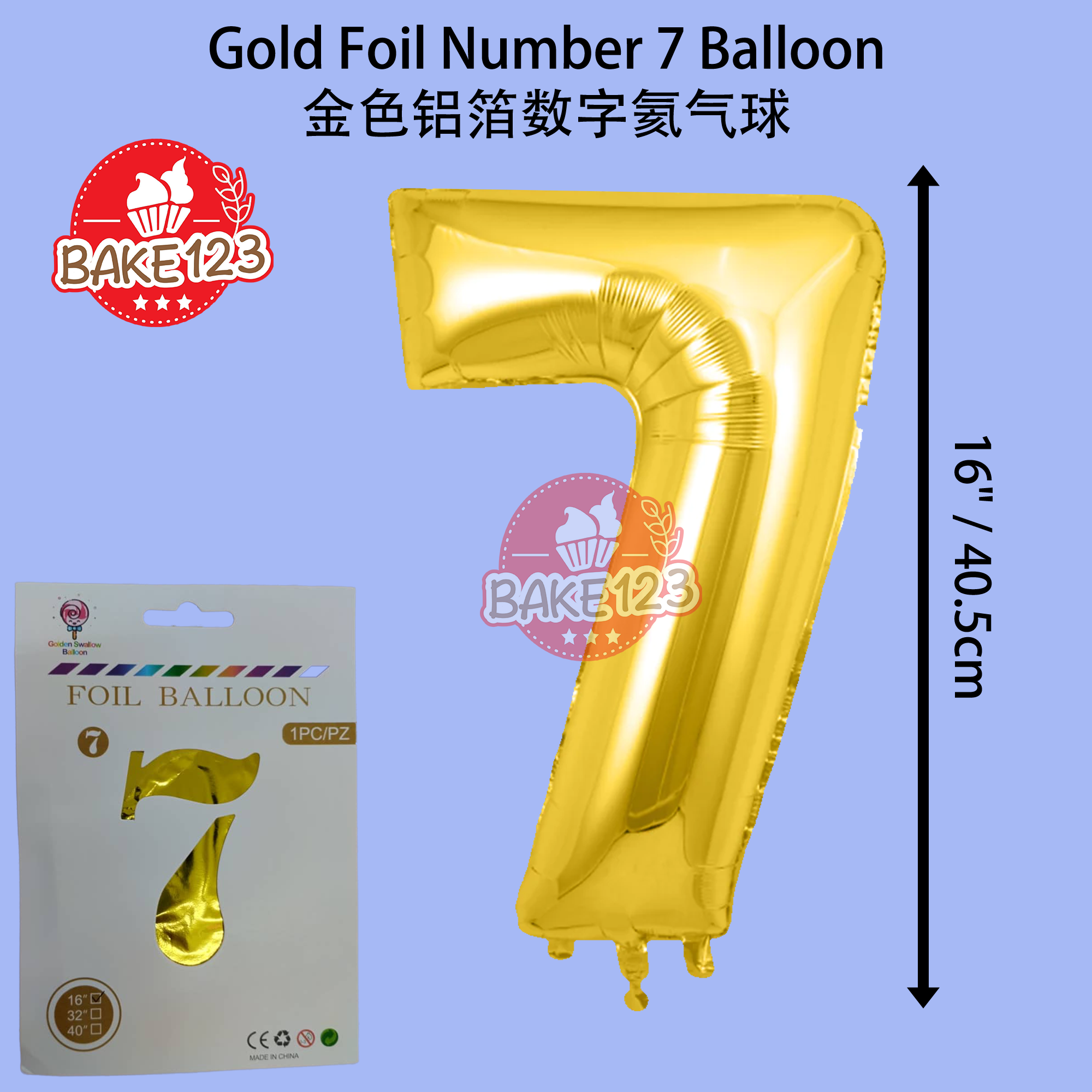 Product Name 产品名称 : 16" Number Foil Balloon Gold 16寸金色铝箔数字氦气球 Number 数字 : 7 Height 高: 16寸 Color 颜色: Gold 金色