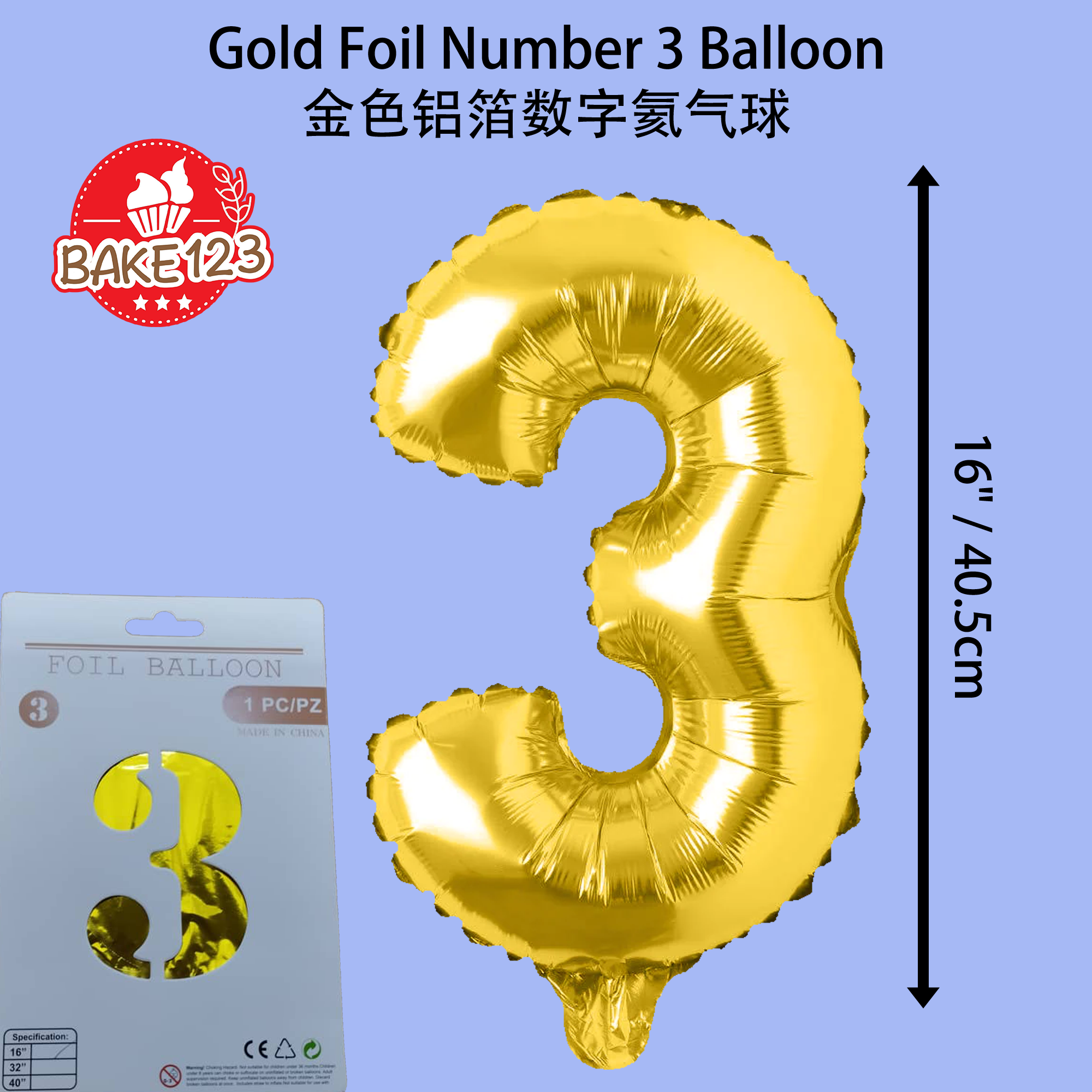 Product Name 产品名称 : 16" Number Foil Balloon Gold 16寸金色铝箔数字氦气球 Number 数字 : 3 Height 高: 16寸 Color 颜色: Gold 金色