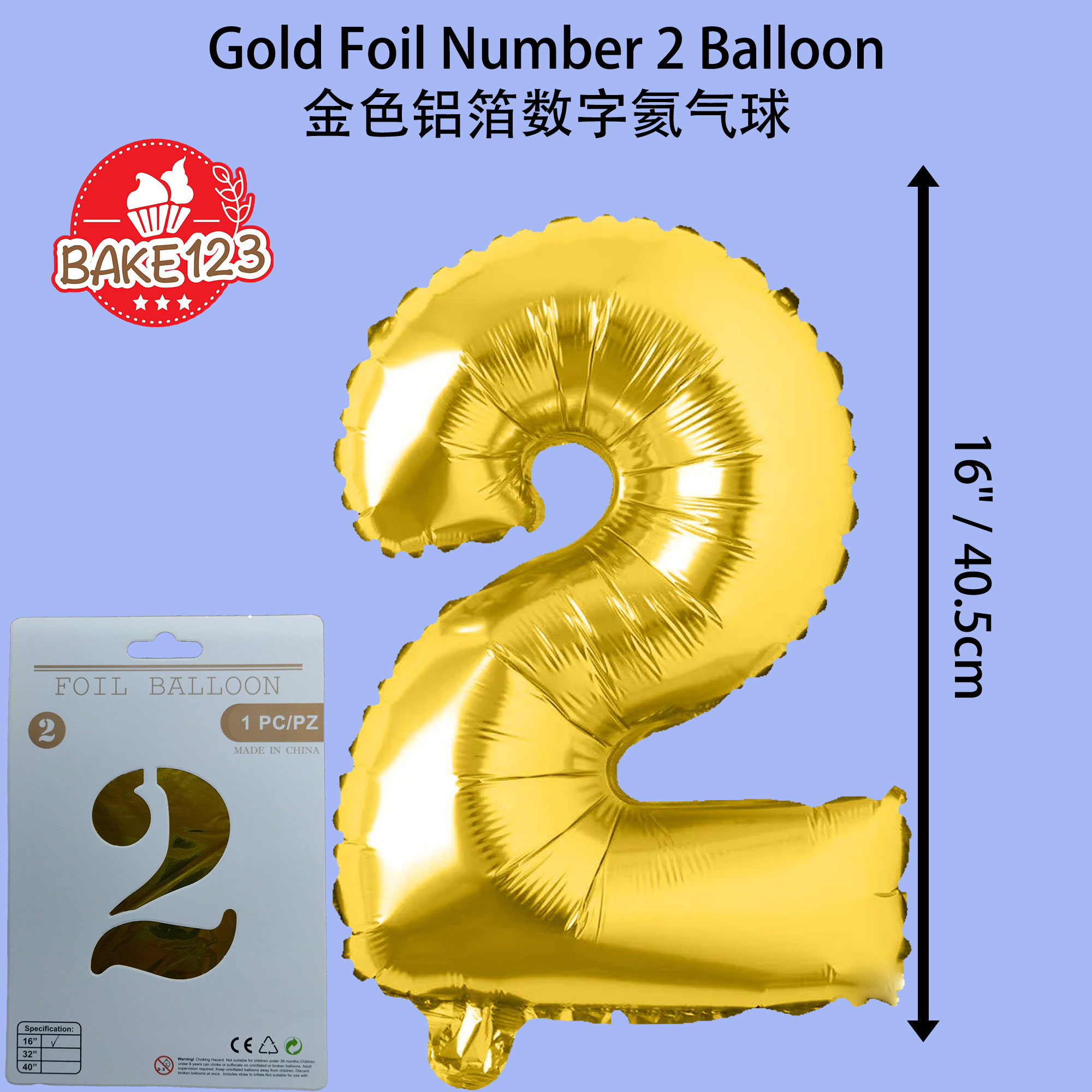 Product Name 产品名称 : 16" Number Foil Balloon Gold 16寸金色铝箔数字氦气球 Number 数字 : 2 Height 高: 16寸 Color 颜色: Gold 金色