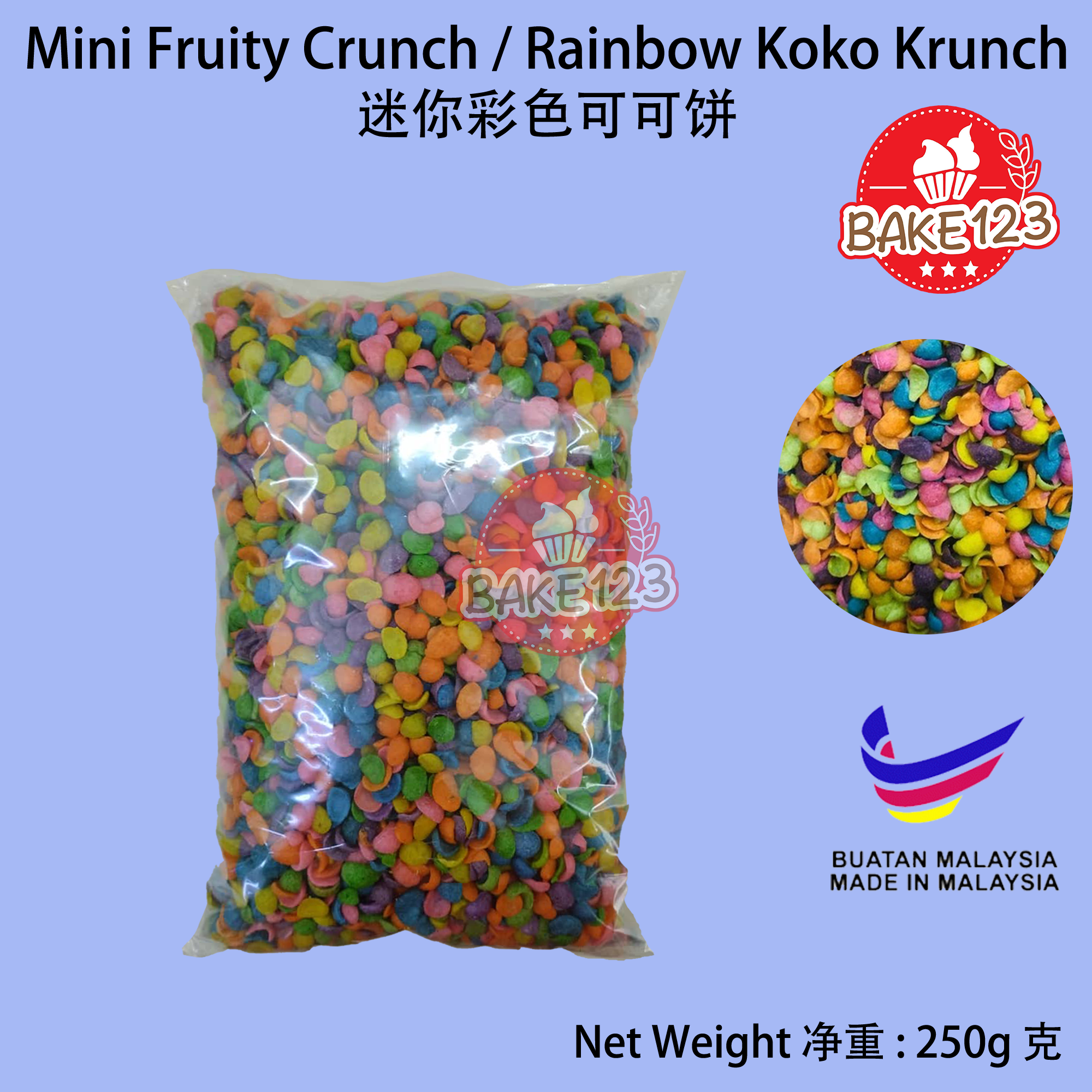 Product Name : Mini Rainbow Fruity Koko Krunch 迷你彩色可可饼 Net Weight 净重 : 250g 克