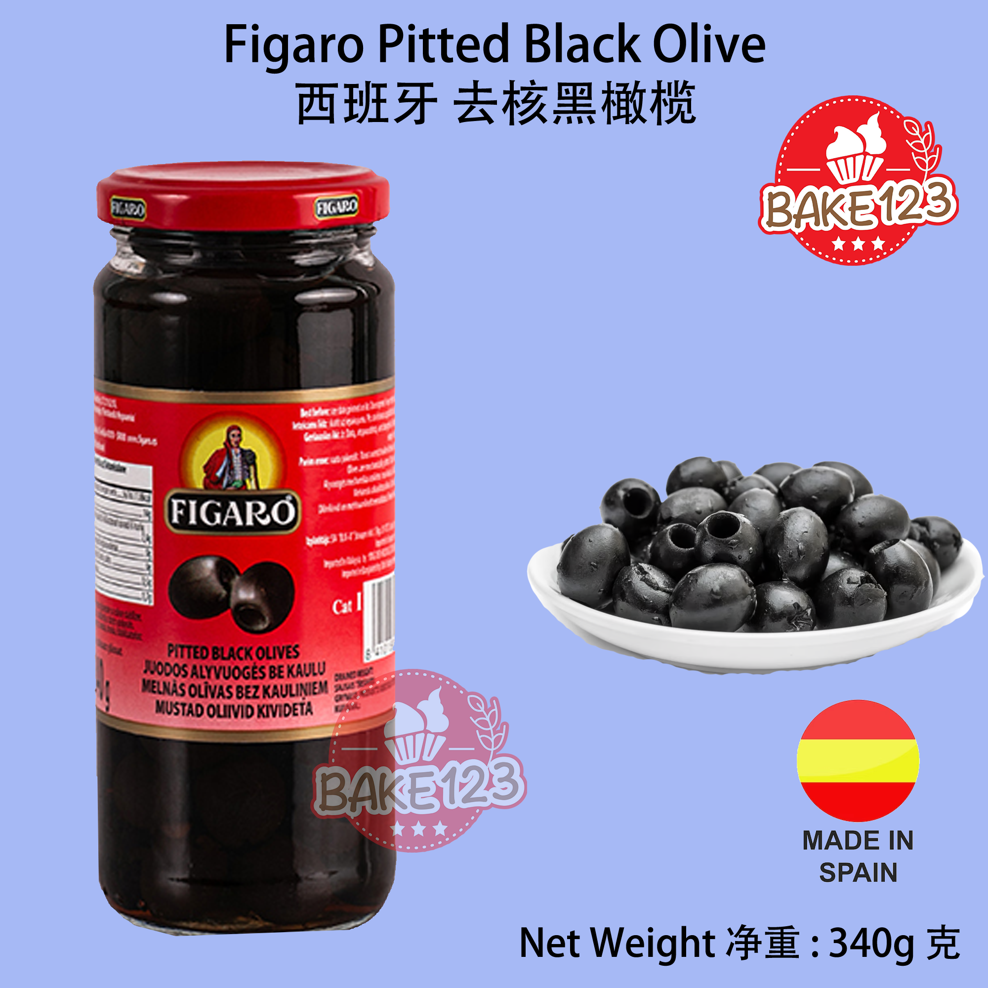 Product Name 产品名称 : Figaro Pitted Black Olives 无核绿橄榄 Country of Origin 原产地 : Spain 西班牙 Net Weight 净重: 340g