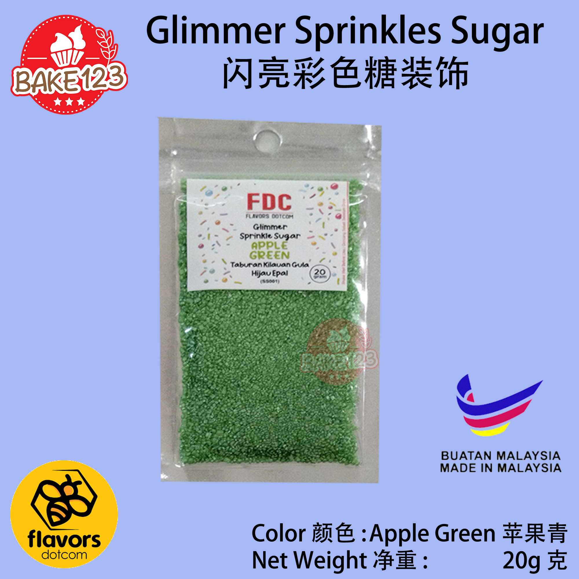 Features 特点: - Gorgeous Glimmer Effect 华丽的闪光效果: The Glimmer Sprinkles Sugar in Apple Green adds a touch of glamour to your treats with its stunning glimmer effect. Elevate the visual appeal of your desserts and baked goods. 苹果绿色的闪光糖为您的美食增添了一丝魅力,带有令人惊叹的闪光效果。提升您的甜点和烘焙食品的视觉吸引力。 - Convenient Sprinkling Packaging 方便撒装包装: The packaging is designed for easy sprinkling, allowing you to add a burst of vibrant color to your cakes, cookies, cupcakes, and more effortlessly. 包装设计方便撒装,让您轻松为蛋糕、饼干、杯子蛋糕等添加一抹鲜艳的色彩。 - Ideal for Decorating Pastries and Desserts 装饰糕点和甜点的理想之选: Glimmer Sprinkles Sugar is perfect for decorating pastries, cookies, and desserts, providing a finishing touch that makes your creations stand out. 闪光糖非常适合装饰糕点、饼干和甜点,为您的创作提供一抹独特的点缀。