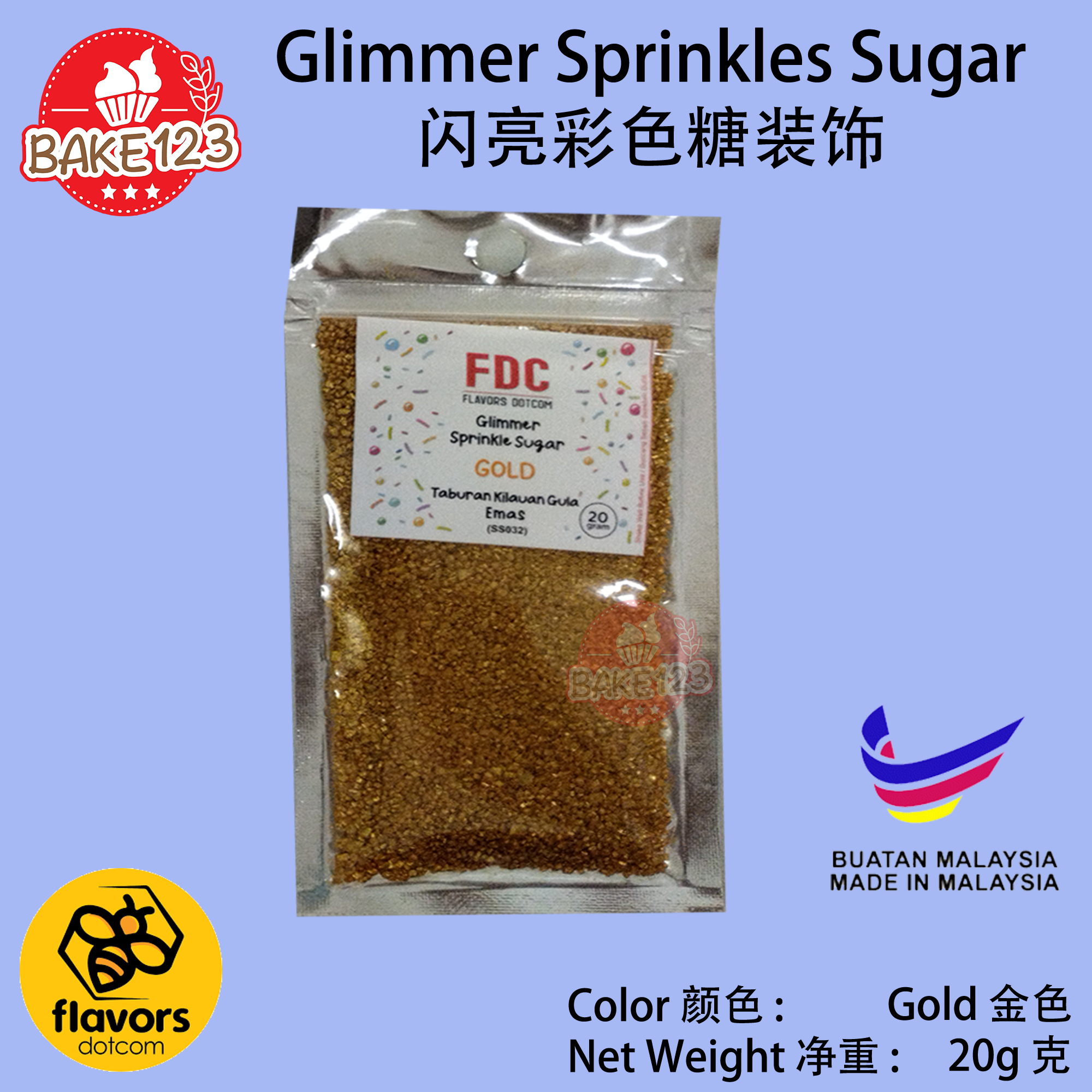 Product Name 产品名称 : Glimmer Sprinkles Sugar 闪亮彩色糖粒装饰 Colour 颜色 : Gold 金色 Net Weight 净重 : 20g 克