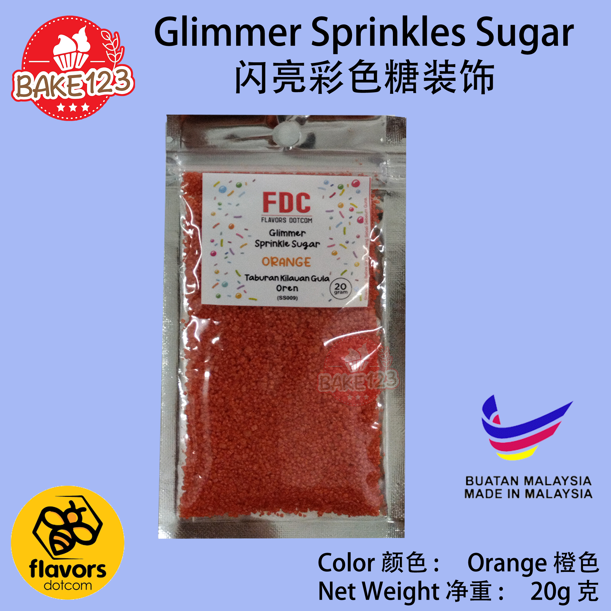 Product Name 产品名称 : Glimmer Sprinkles Sugar 闪亮彩色糖粒装饰 Colour 颜色 : Orange 橙色 Net Weight 净重 : 20g 克