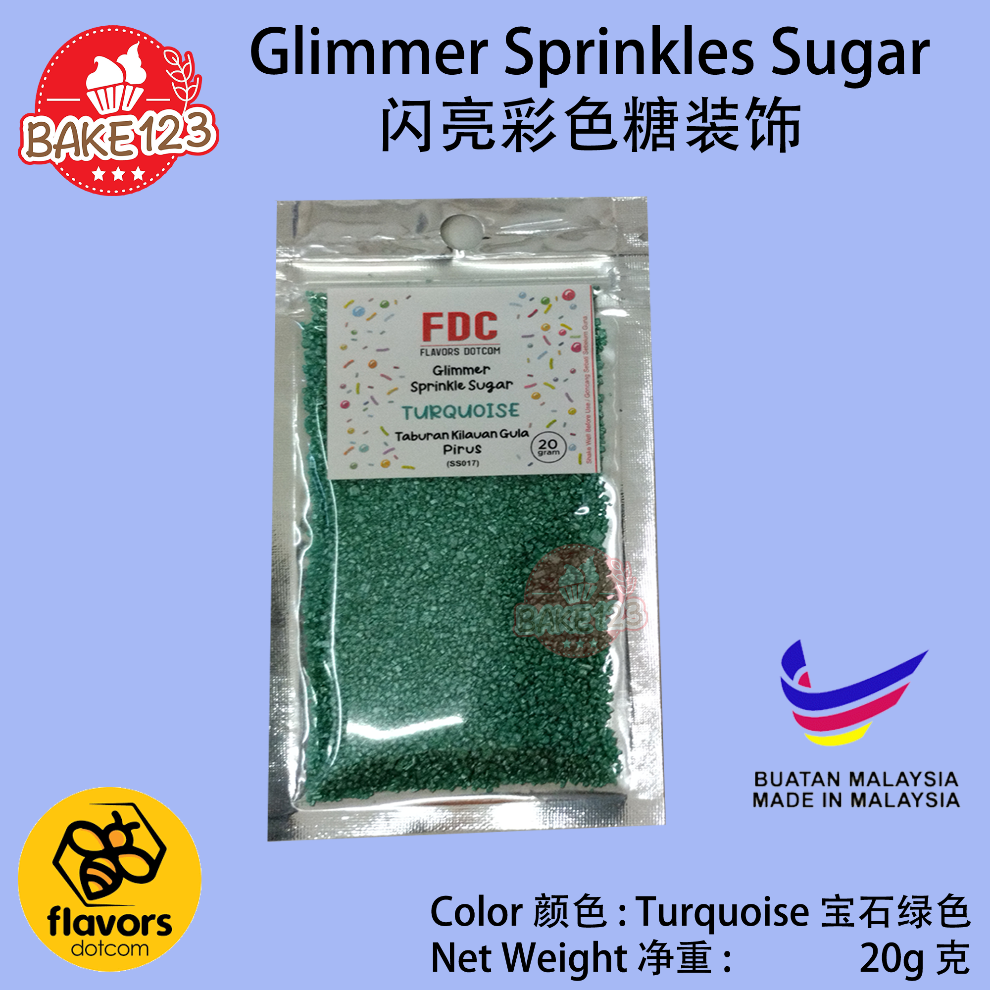 Product Name 产品名称 : Glimmer Sprinkles Sugar 闪亮彩色糖粒装饰 Colour 颜色 : Turquoise 宝石青 Net Weight 净重 : 20g 克