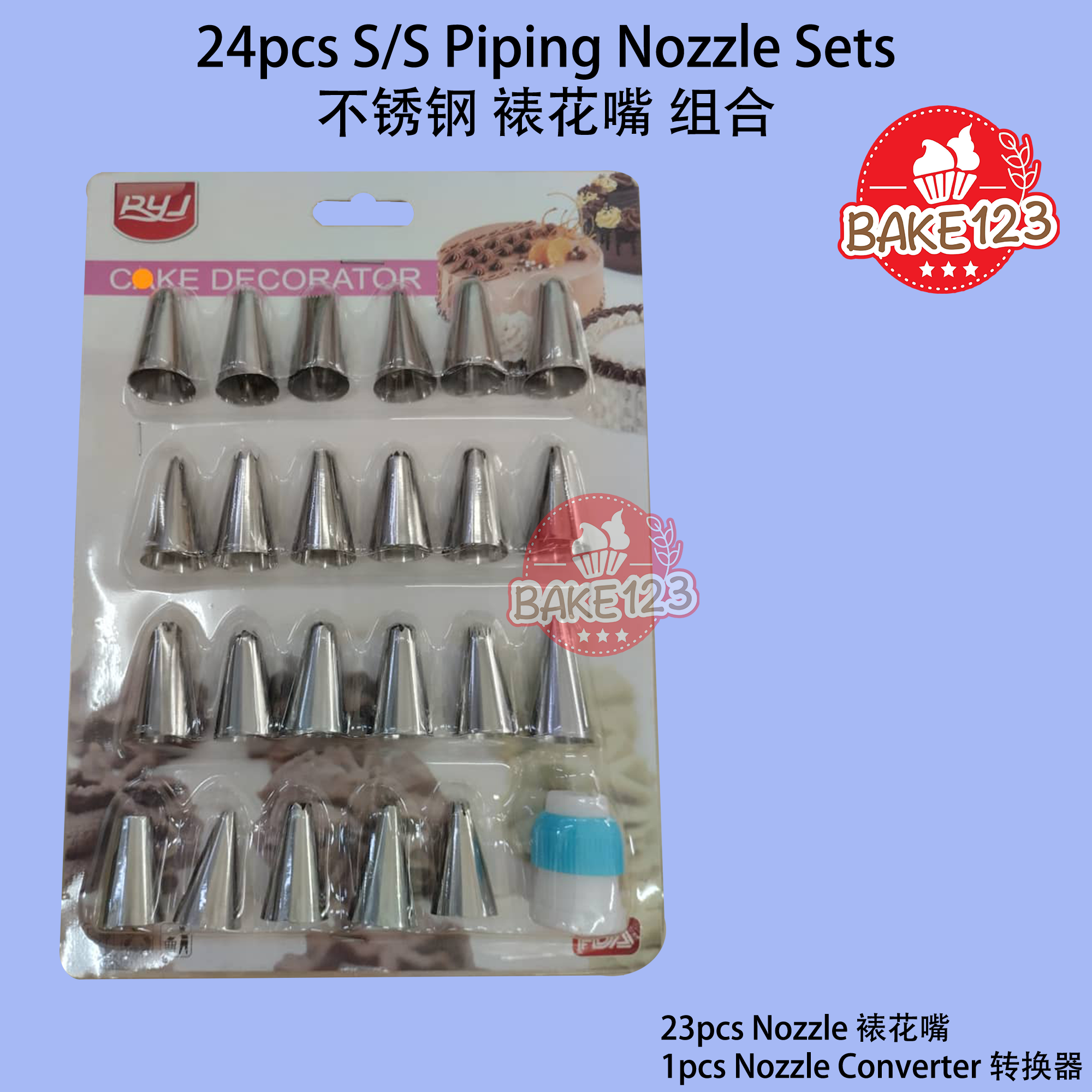 Product Name 产品名称 : 24pcs Stainless Steel Piping Tip Nozzle Sets / 24个不锈钢裱花嘴套装 Specifications 规格: Material 材质: Stainless Steel 不锈钢 Quantity 数量: 23 Nozzles + 1 Piping Nozzle Converter 23个裱花嘴 + 1个裱花嘴转接器