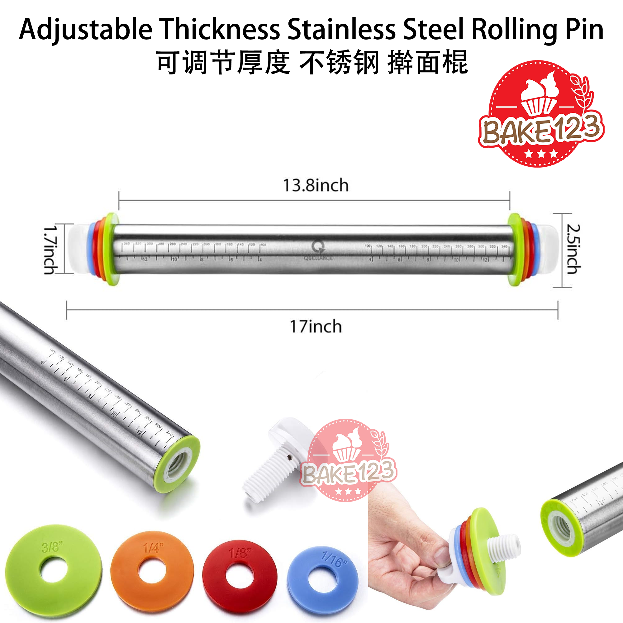 Features 特点: - Adjustable Thickness 可调节厚度: This stainless steel rolling pin is equipped with adjustable rings that allow you to easily change the thickness of your dough. With four thickness options (10/6/3/2mm), you can achieve precise control over your pastry and ensure consistent results. 这款不锈钢擀面杖配备了可调节环,让您轻松更改面团的厚度。有四个厚度选项(10/6/3/2毫米),您可以精确掌握您的糕点,并确保始终如一的效果。 - Durable Stainless Steel Construction 耐用的不锈钢结构: Crafted from high-quality stainless steel, this rolling pin is durable, resistant to rust, and easy to clean. The sleek and smooth surface ensures effortless rolling for all your baking needs. 采用优质不锈钢制成,这款擀面杖耐用、抗锈,并且易于清洁。光滑平整的表面确保您可以轻松擀出所需的面团。 - Precise and Consistent Rolling 精确且一致的擀动: The adjustable rings provide a guide for achieving the desired thickness, ensuring that your dough is rolled evenly. This feature is especially useful when creating pastries, pizzas, and other baked goods. 可调节的环为实现所需的厚度提供了指导,确保您的面团擀得均匀。这个特点在制作糕点、比萨饼和其他烘焙食品时尤其有用。 - Multipurpose Usage 多用途使用: Suitable for rolling out various types of dough, including pastry, cookie, pasta, and more. The adjustable thickness makes it a versatile tool for home bakers and professional chefs alike. 适用于擀面团,包括糕点、饼干、意面等各种类型的面团。可调节的厚度使其成为家庭面点师和专业厨师的多功能工具。