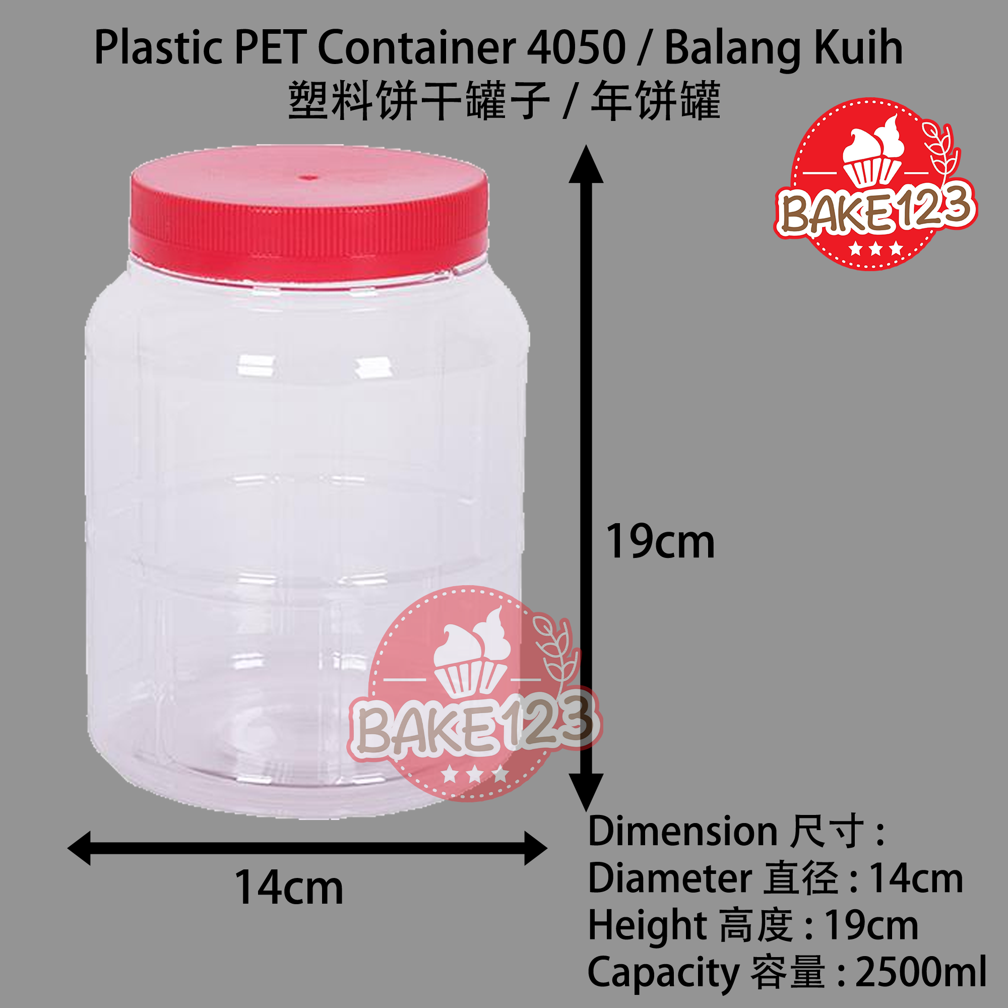 Product Name 产品名称 : Plastic PET Jar Container / 塑料PET罐容器 Code 代号 : 4050 Size Dimension 尺寸 : 140mm x 190mm (Diameter 直径 x Height 高度) Capacity 容量: 2500ml