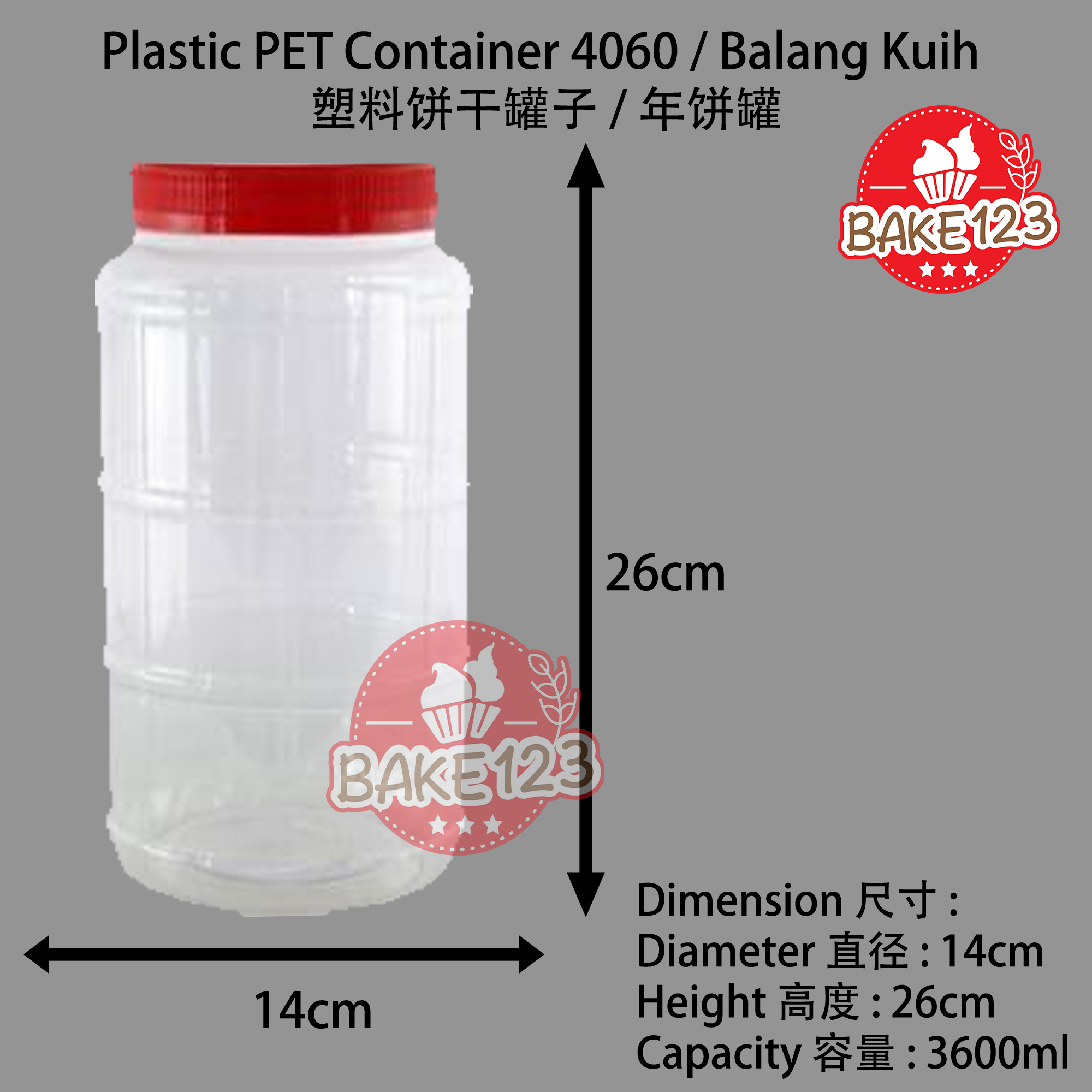 Product Name 产品名称 : Plastic PET Jar Container / 塑料PET罐容器 Code 代号 : 4060 Size Dimension 尺寸 : 140mm x 260mm (Diameter 直径 x Height 高度) Capacity 容量: 3600ml