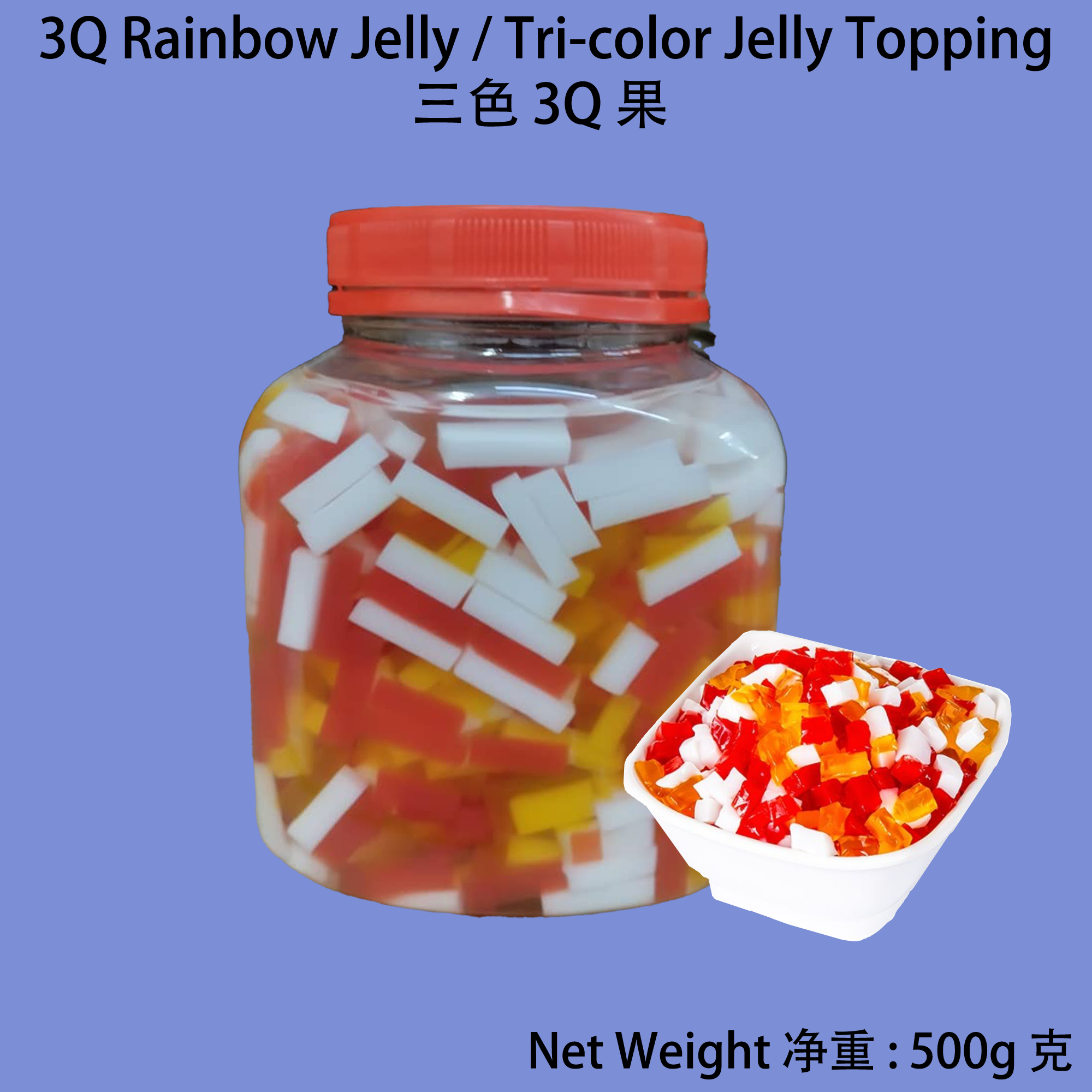 Features 特点: - Vibrant Tri-color Delight 鲜艳三色果冻: Our rainbow jelly features three vibrant colors that add a burst of excitement to your desserts. Each color layer is beautifully transparent, creating a visually stunning effect in your creations. 我们的三色果冻拥有三种鲜艳的颜色,为您的甜点增添了一抹活力。每一层颜色都透明美丽,为您的创作营造出视觉上的惊艳效果。 - Soft and Chewy Texture 软糯有嚼劲: Enjoy the delightful texture of our rainbow jelly, which is soft, smooth, and chewy. It adds a fun and enjoyable mouthfeel to your desserts, making every bite a delightful experience. 享受我们三色果冻的美妙口感,柔软、顺滑且有嚼劲。它为您的甜点增添了趣味和愉悦的口感,使每一口都成为愉快的体验。 - Versatile Decoration 多用途装饰: Use our rainbow jelly as a decorative element for your desserts, particularly for creating the look of boba (similar to tapioca pearls). The colorful jelly balls add visual appeal and a playful touch to beverages, ice cream, puddings, and more. 将我们的三色果冻作为甜点的装饰元素,特别是用于制作类似于波霸(类似于粉圆)的外观。五彩缤纷的果冻珠为饮料、冰淇淋、布丁等增添了视觉吸引力和趣味感。 - Convenient and Ready-to-Use 便捷即食: Our rainbow jelly comes pre-cut into small, bite-sized pieces, making it convenient for immediate use. Simply add it to your desserts or beverages to instantly elevate their appearance and taste. 我们的三色果冻已经预先切成小巧的一口大小,方便您立即使用。只需将其加入到您的甜点或饮料中,即可立即提升其外观和味道。