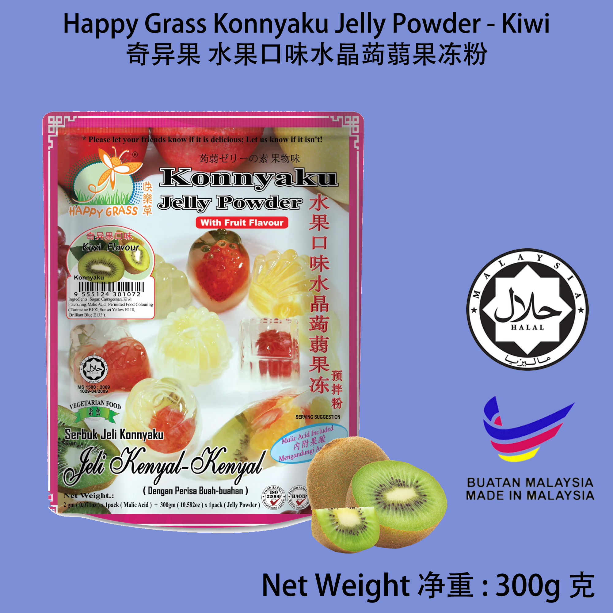 Product Name 产品名称: Happy Grass Konnyaku Jelly Powder Kiwi 快乐草 蒟蒻果冻粉 奇异果味 Net Weight 净重 : 300g 克