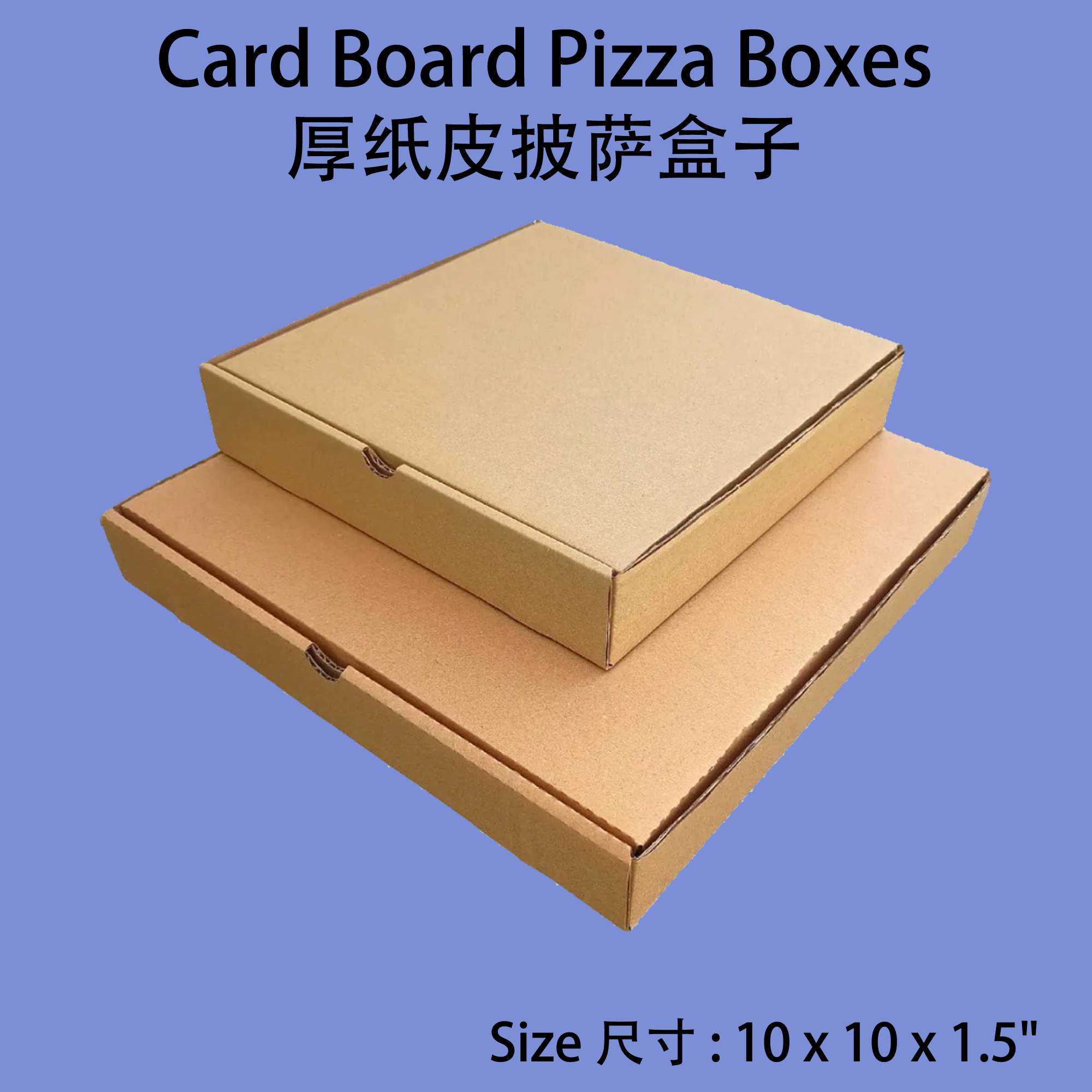 Features 特点: - Durable Cardboard Construction 耐用的纸板结构: This pizza box is crafted from sturdy and durable cardboard material, ensuring that your pizzas remain intact and secure during transport. 采用坚固耐用的纸皮材料制成,确保您的披萨在运输过程中保持完好无损。 - Standard Size 标准尺寸: With dimensions of 10 inches by 10 inches by 1.5 inches, this pizza box is suitable for holding most standard-sized pizzas, providing ample space for your delicious creations. 尺寸为10英寸×10英寸×1.5英寸,适用于大多数标准尺寸的披萨,为您美味的创作提供充足的空间。 - Foldable Design 折叠设计: The pizza box features a foldable design for easy assembly and storage. Simply fold along the creases to assemble the box quickly and efficiently. 披萨盒采用折叠设计,便于组装和存储。只需沿着折痕折叠,即可快速高效地组装盒子。 - Secure Closure 安全关闭: Equipped with flaps and tabs, this pizza box ensures a secure closure to keep your pizzas hot and fresh until they reach their destination. The tabs provide added stability during transportation. 配有盖翼和标签,确保安全关闭,让您的披萨在送达目的地之前保持热气腾腾、新鲜美味。标签在运输过程中提供额外的稳定性。