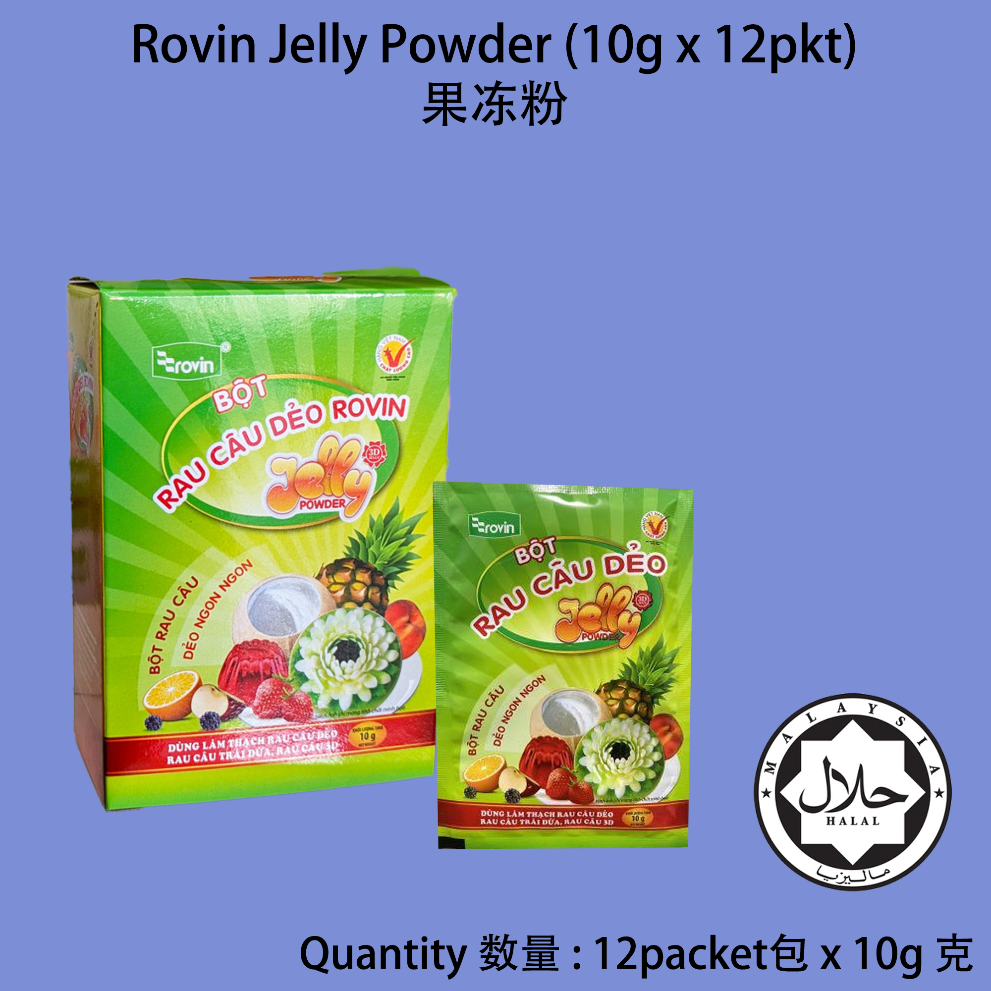 Product Name 产品名称 : Rovin Jelly Powder 果冻粉 Net Weight 净重 : 10g 克 x 12pkt 包(Total 总计 : 120g 克) Brand 品牌 : Rovin