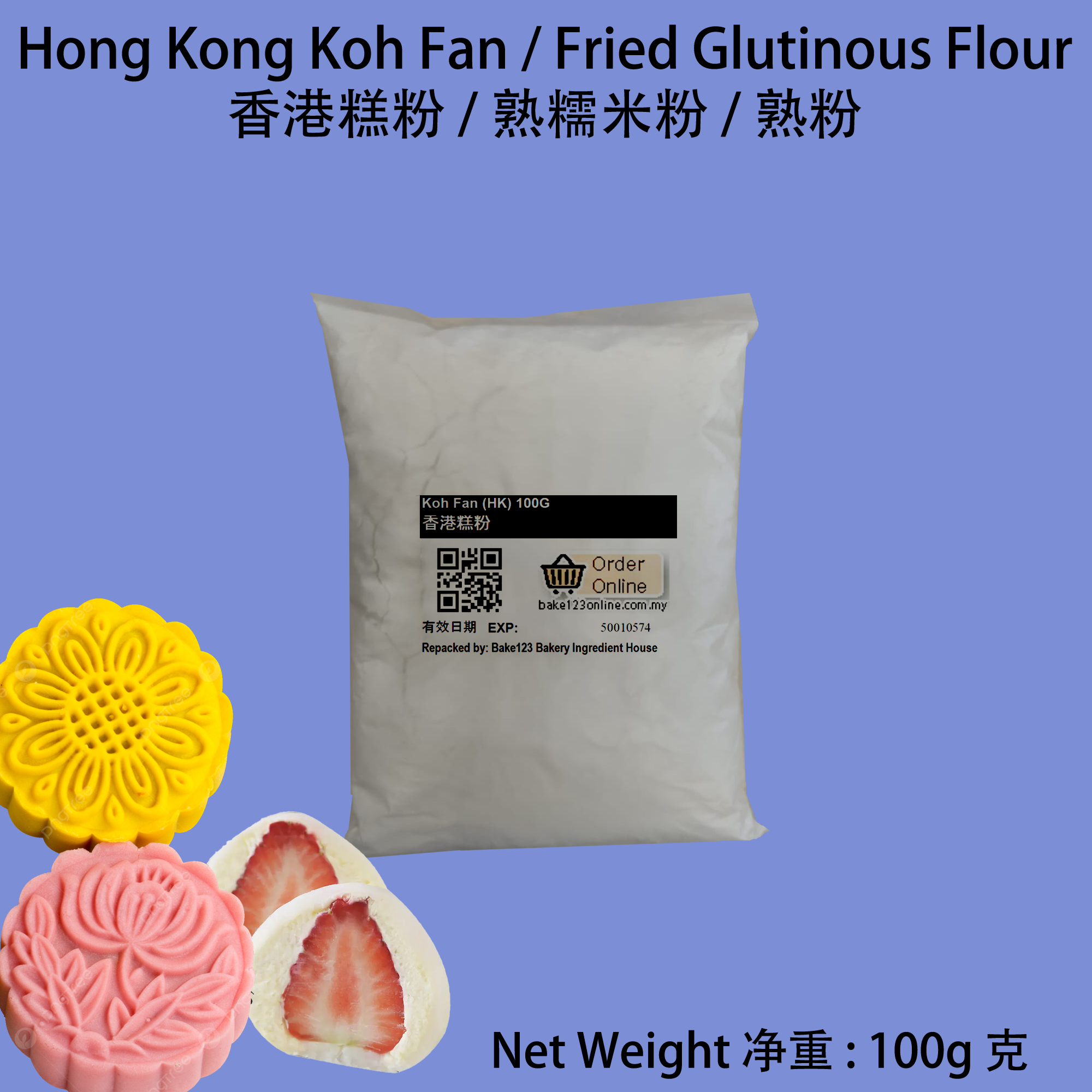 Features 特点: - Authentic Hong Kong Gao Fen 正宗香港糕粉: Koh Fan, also known as Gao Fen or fried glutinous rice flour, is a staple ingredient for Snowskin Mooncake, also for making traditional Chinese desserts. Koh Fan,又称糕粉或熟糯米粉,是冰皮月饼和雪梅娘的主要原料之一,是制作传统的中式甜点的材料。 - Versatile Usage 多用途: This glutinous rice flour can be used to create a variety of sweet and savory dishes, offering versatility in both home and professional kitchens. 这种糯米粉可以用来制作各种甜味和咸味菜肴,在家庭和专业厨房中都能发挥多样性。 - Fine Texture 细腻口感: Koh Fan (HK) features a fine texture, ensuring smooth and silky results in your culinary creations. 香港糕粉具有细腻的口感,确保您的烹饪作品口感顺滑细腻。 - Convenient Packaging 方便包装: This product comes in a convenient 100g pack, making it easy to measure and use for various recipes. 这款产品采用便捷的100克包装,方便您根据不同食谱进行测量和使用。