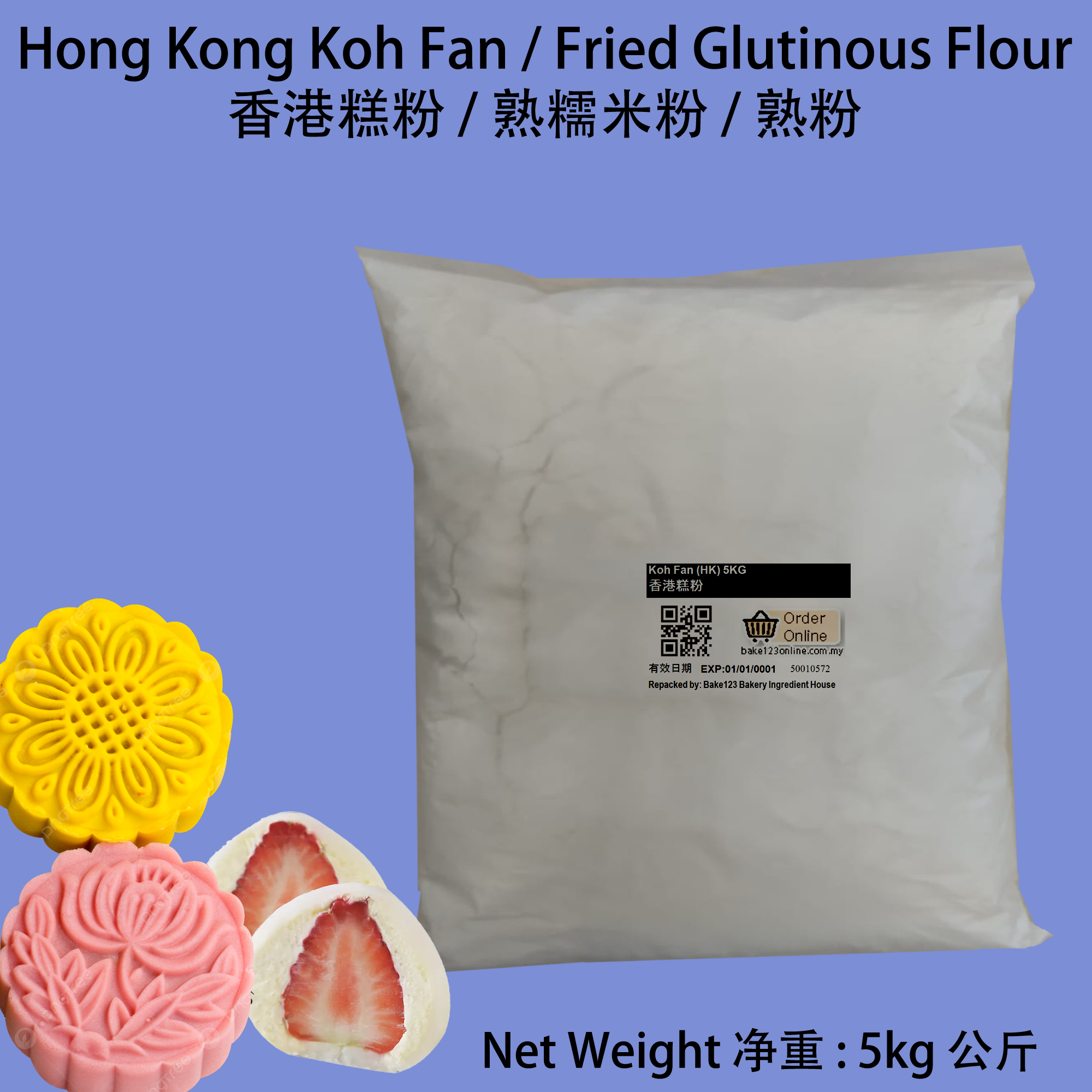 Features 特点: - Authentic Hong Kong Gao Fen 正宗香港糕粉: Koh Fan, also known as Gao Fen or fried glutinous rice flour, is a staple ingredient for Snowskin Mooncake, also for making traditional Chinese desserts. Koh Fan,又称糕粉或熟糯米粉,是冰皮月饼和雪梅娘的主要原料之一,是制作传统的中式甜点的材料。 - Versatile Usage 多用途: This glutinous rice flour can be used to create a variety of sweet and savory dishes, offering versatility in both home and professional kitchens. 这种糯米粉可以用来制作各种甜味和咸味菜肴,在家庭和专业厨房中都能发挥多样性。 - Fine Texture 细腻口感: Koh Fan (HK) features a fine texture, ensuring smooth and silky results in your culinary creations. 香港糕粉具有细腻的口感,确保您的烹饪作品口感顺滑细腻。