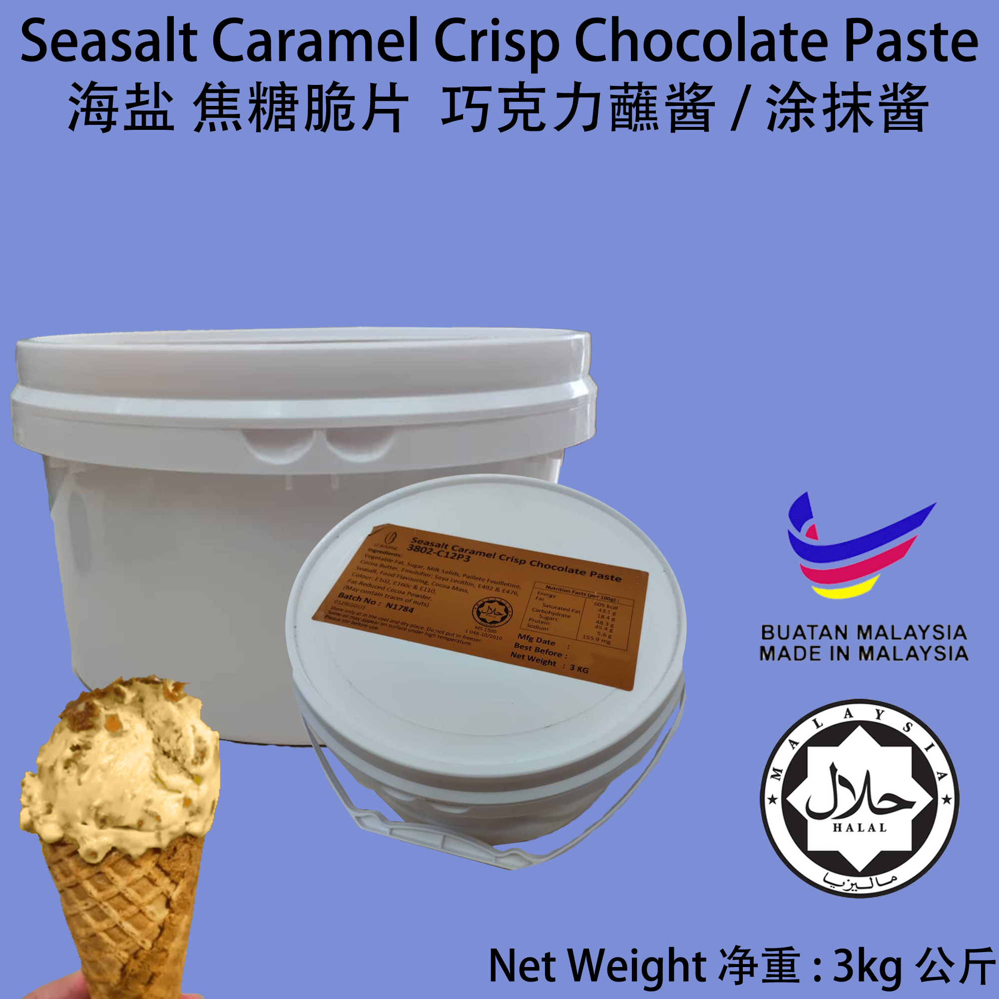 Features 特点: - Exquisite Blend of Flavors 精致的口味混合: Sea Salt Caramel Crisp Chocolate Paste combines the rich taste of chocolate with the sweet indulgence of caramel and a hint of sea salt, creating a delightful harmony of flavors. 海盐焦糖巧克力酱融合了浓郁的巧克力味、焦糖味和一丝海盐的味道,打造出美妙的口味和谐。 - Versatile Usage 多用途: This chocolate paste is incredibly versatile and can be used in various culinary applications, including as a filling for pastries, cakes, and desserts, or as a topping for ice cream, pancakes, waffles, and more. 这款巧克力酱用途广泛,可用作糕点、蛋糕和甜点的馅料,也可用作冰淇淋、煎饼、华夫饼等的配料。 - Premium Quality Premium品质: Made with high-quality ingredients and crafted with precision, Salt Caramel Crisp Chocolate Paste offers a luxurious taste experience that will elevate any dessert or pastry creation. 采用高品质的原料精心制作,提供了豪华的味觉体验,将提升任何甜点或糕点的品质。 - Convenient Packaging 方便的包装: Packaged in a convenient 3KG container, this chocolate paste is easy to store and use, ensuring that you always have a delicious treat on hand for your culinary adventures. 这款巧克力酱包装在方便的3KG容器中,易于存放和使用,确保您在烹饪冒险中始终拥有美味的享受。