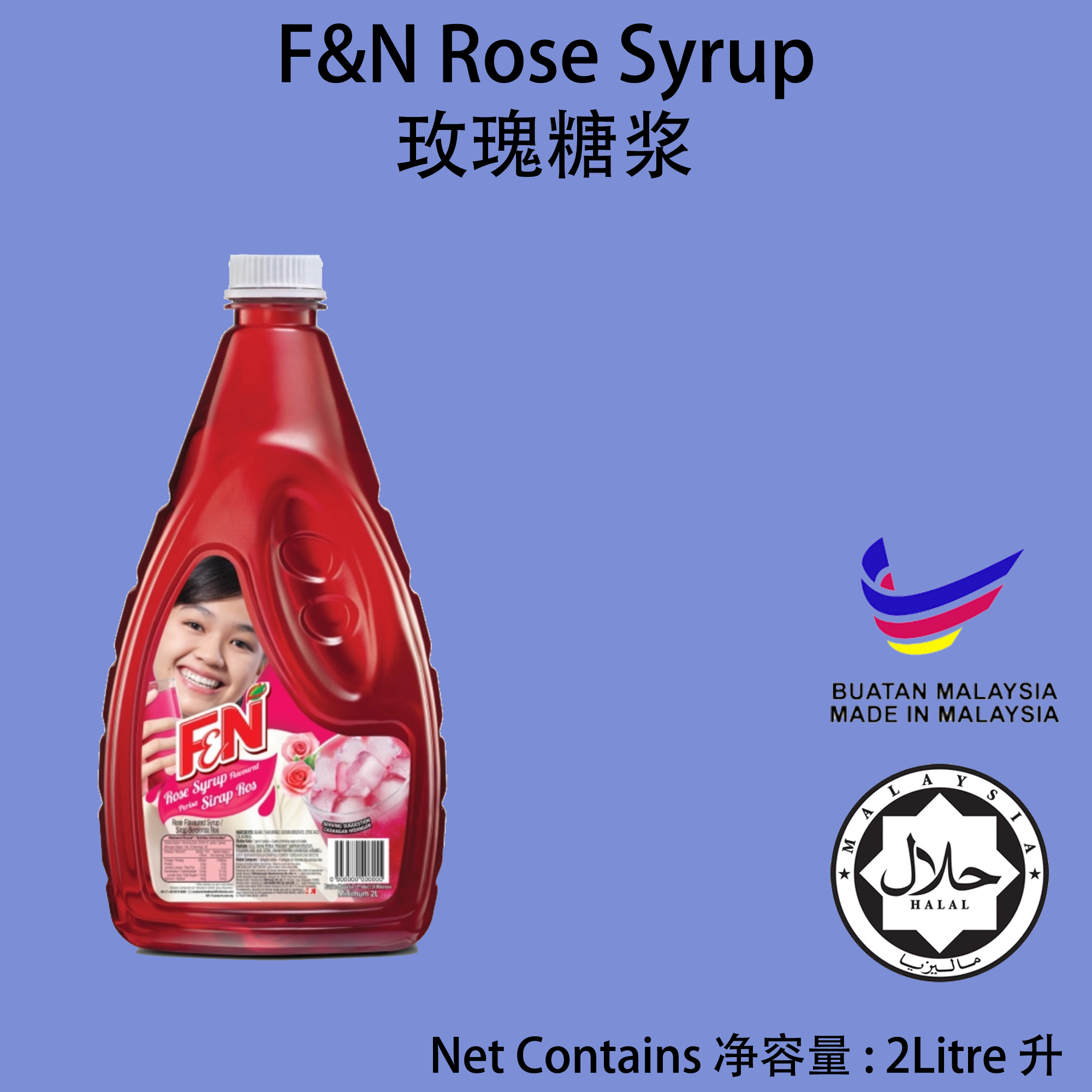 Product Name/产品名称: F&N Rose Syrup - F&N 玫瑰糖浆 Net Volume/净容量: 2 Liters - 2升