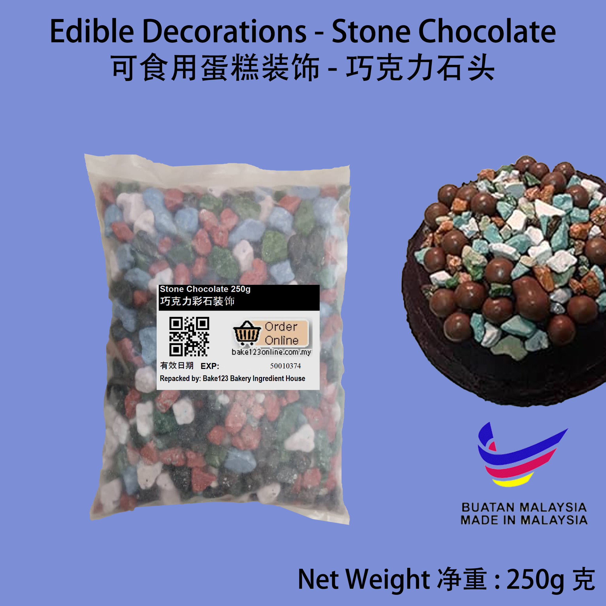 Product Name 产品名称: Stone Chocolate Edible Cake Decorative Sprinkles 石头巧克力可食用蛋糕装饰 Net Weight 净重 : 250g 克