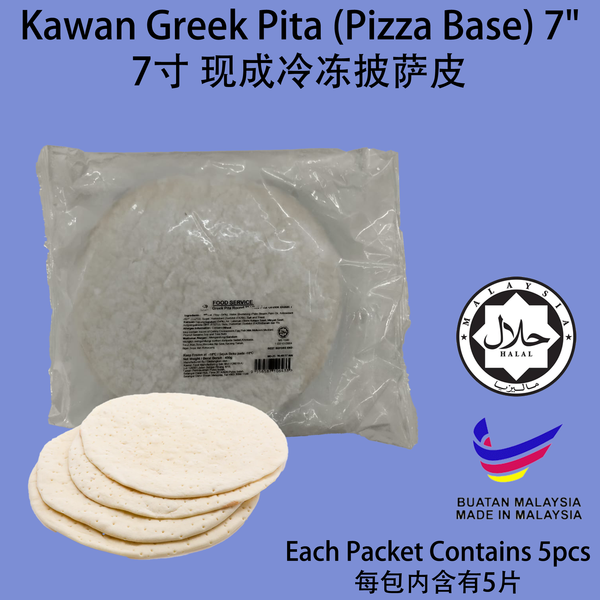 Product Name/产品名称: Kawan Greek Pita 7Inch / Pizza Base 阿拉伯皮塔饼 / 口袋面包 / 披萨面饼7英寸 Quantity / 数量 : 5pcs 片