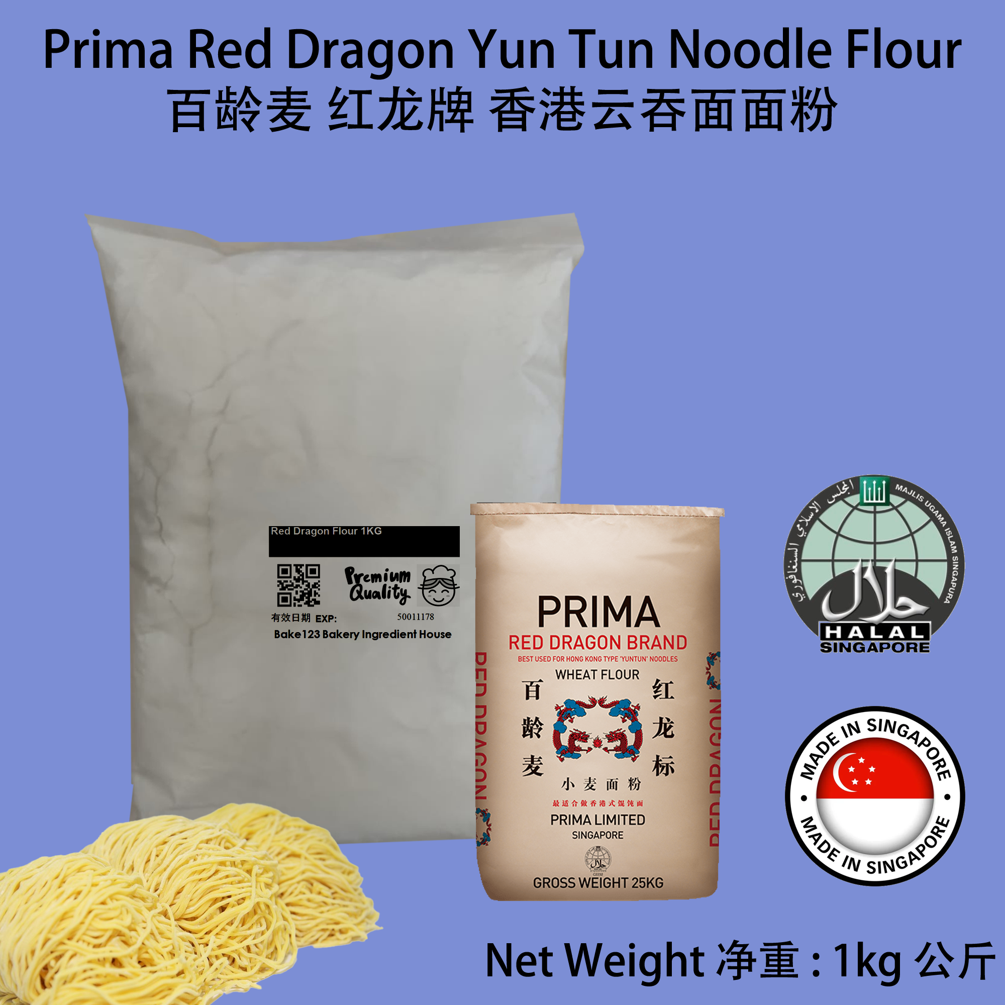 Product Name/产品名称: Prima Red Dragon Brand Yun Tun Noodle Flour / 百龄麦 红龙牌 港式云吞面面粉