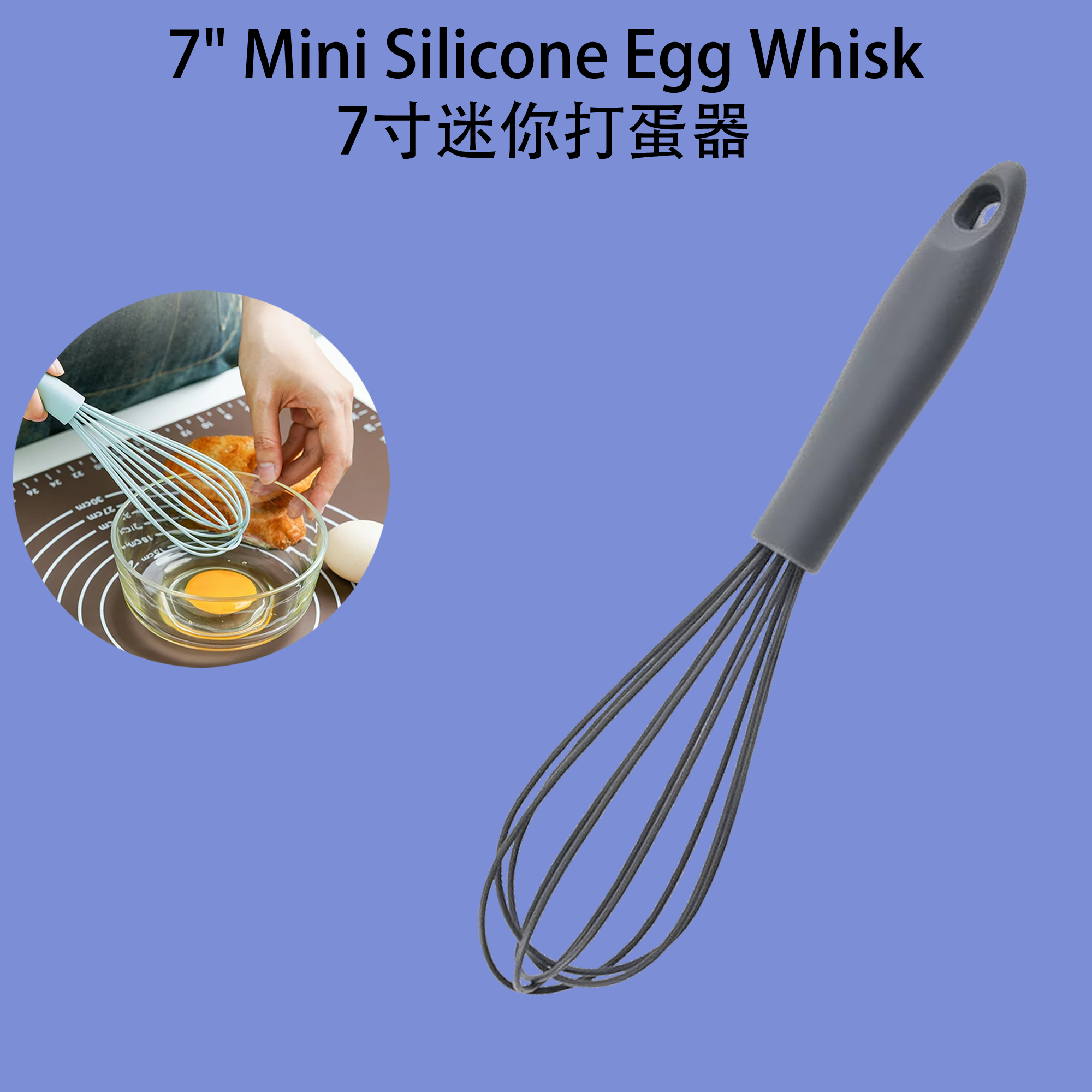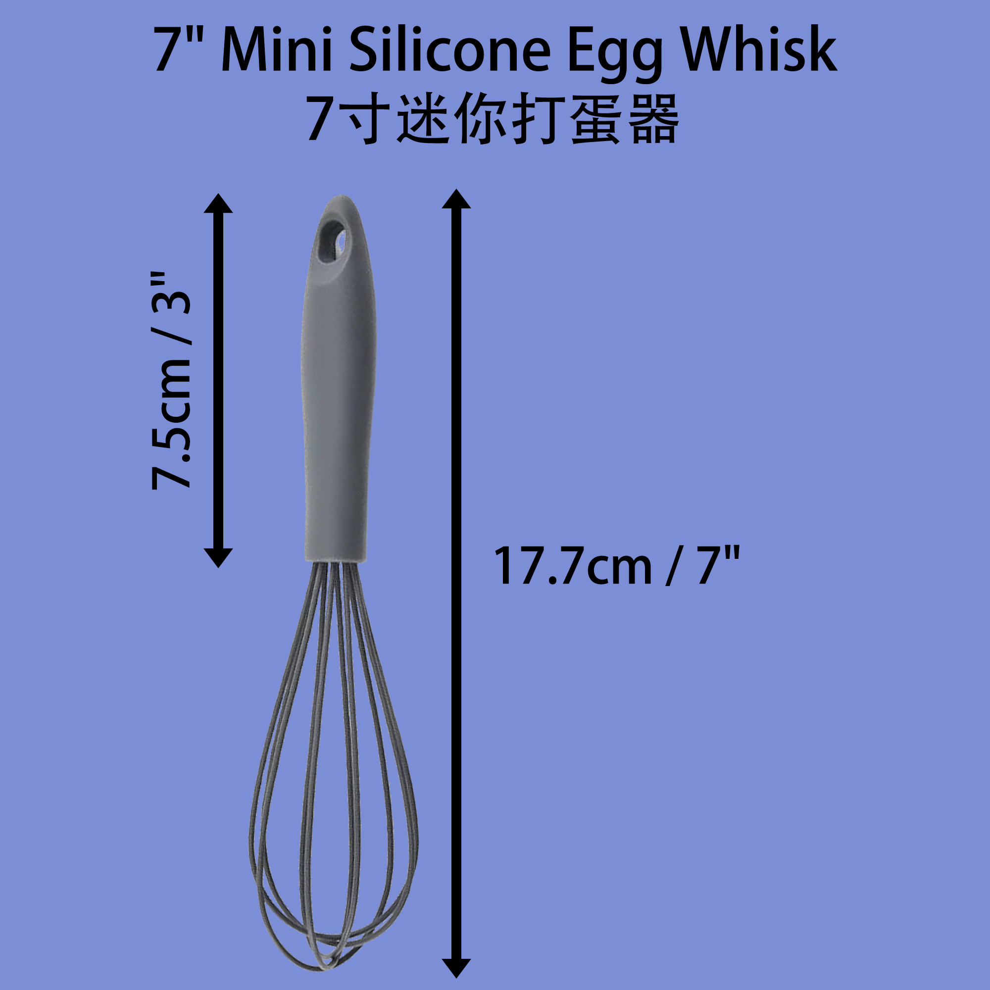 Product Name / 产品名称: 7-Inch Mini Silicone Egg Whisk 7英寸迷你硅胶打蛋器 Material 材质: Silicone 硅胶 Size 尺寸: 7 inches / 7英寸(17.78cm / 厘米)