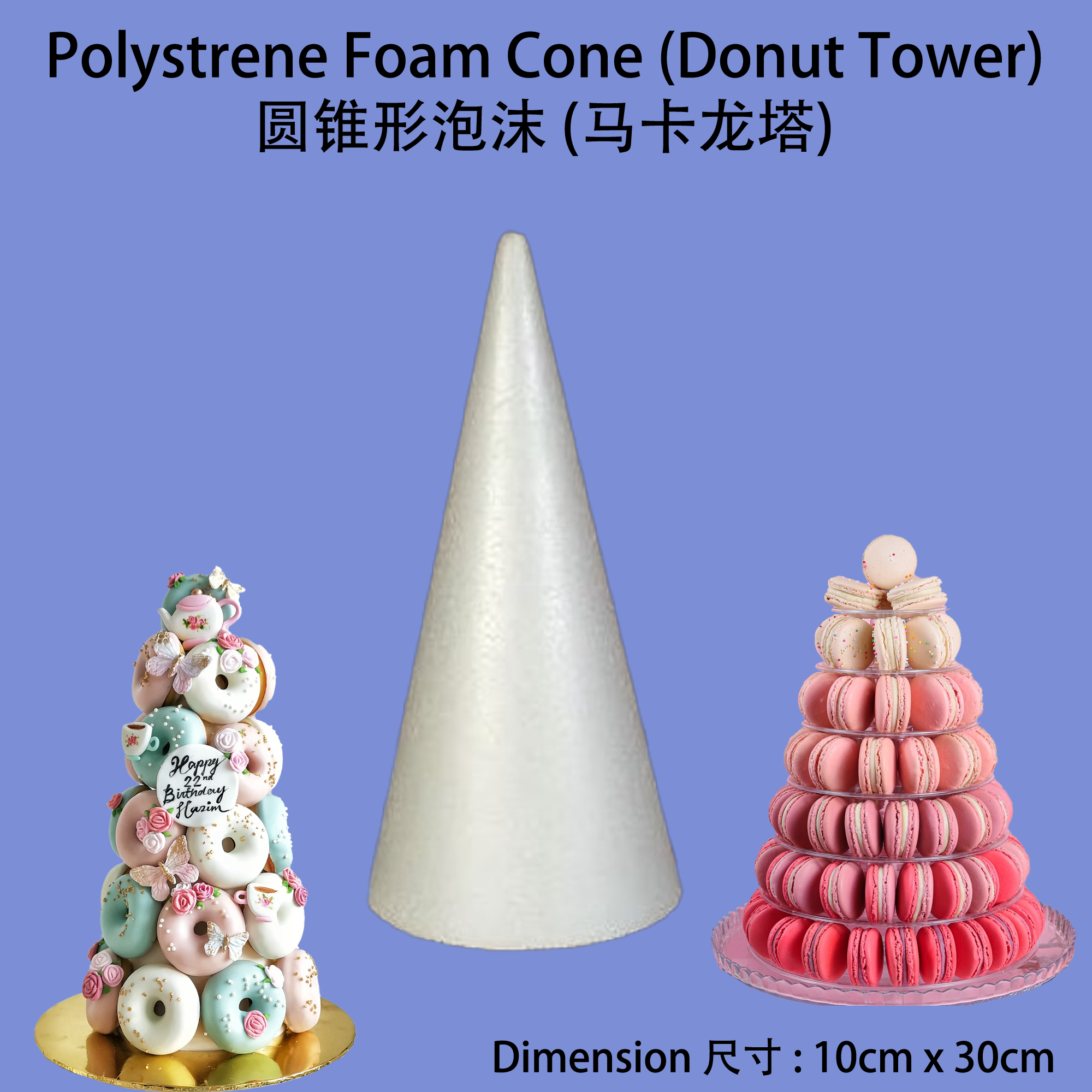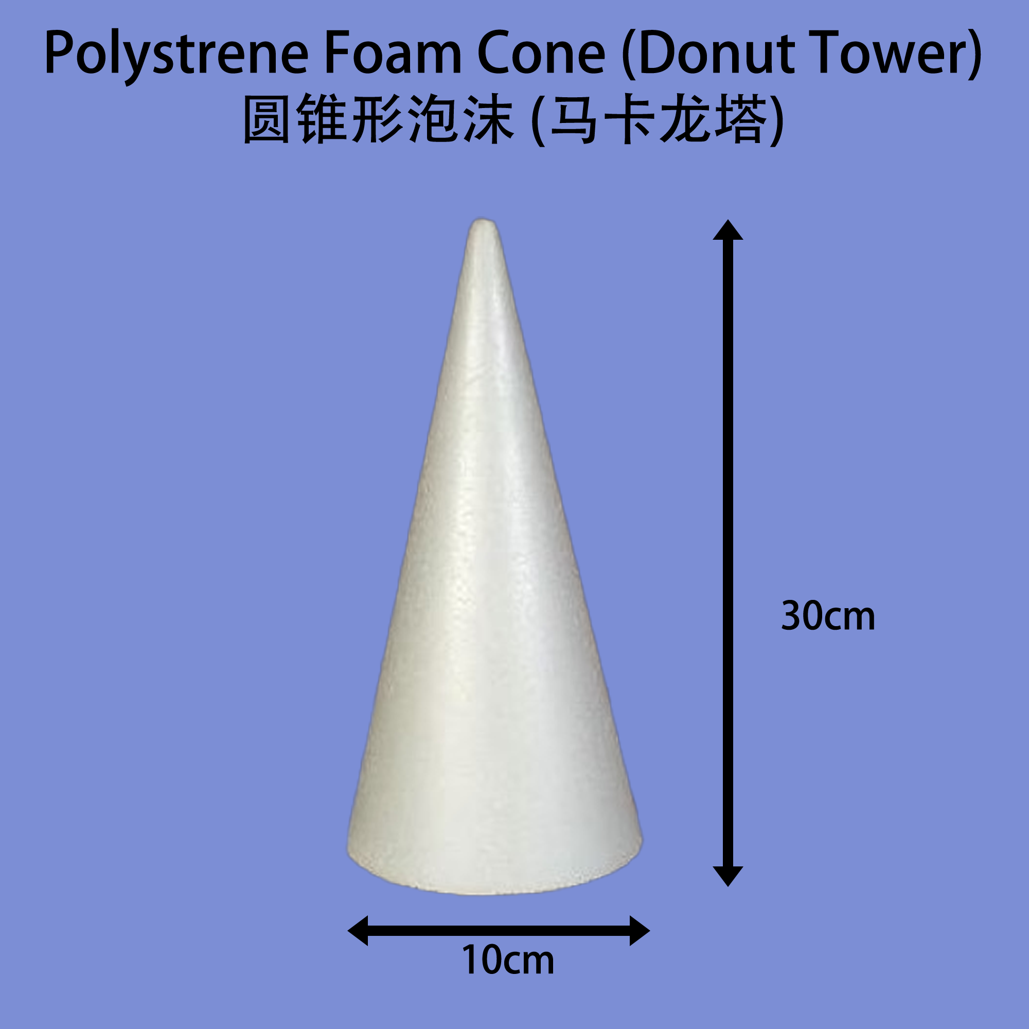 Product Name / 产品名称: Styrofoam Cone 泡沫塑料圆锥体 Size 尺寸: 10cm x 30cm ( Width 宽度 x Height 高度 )
