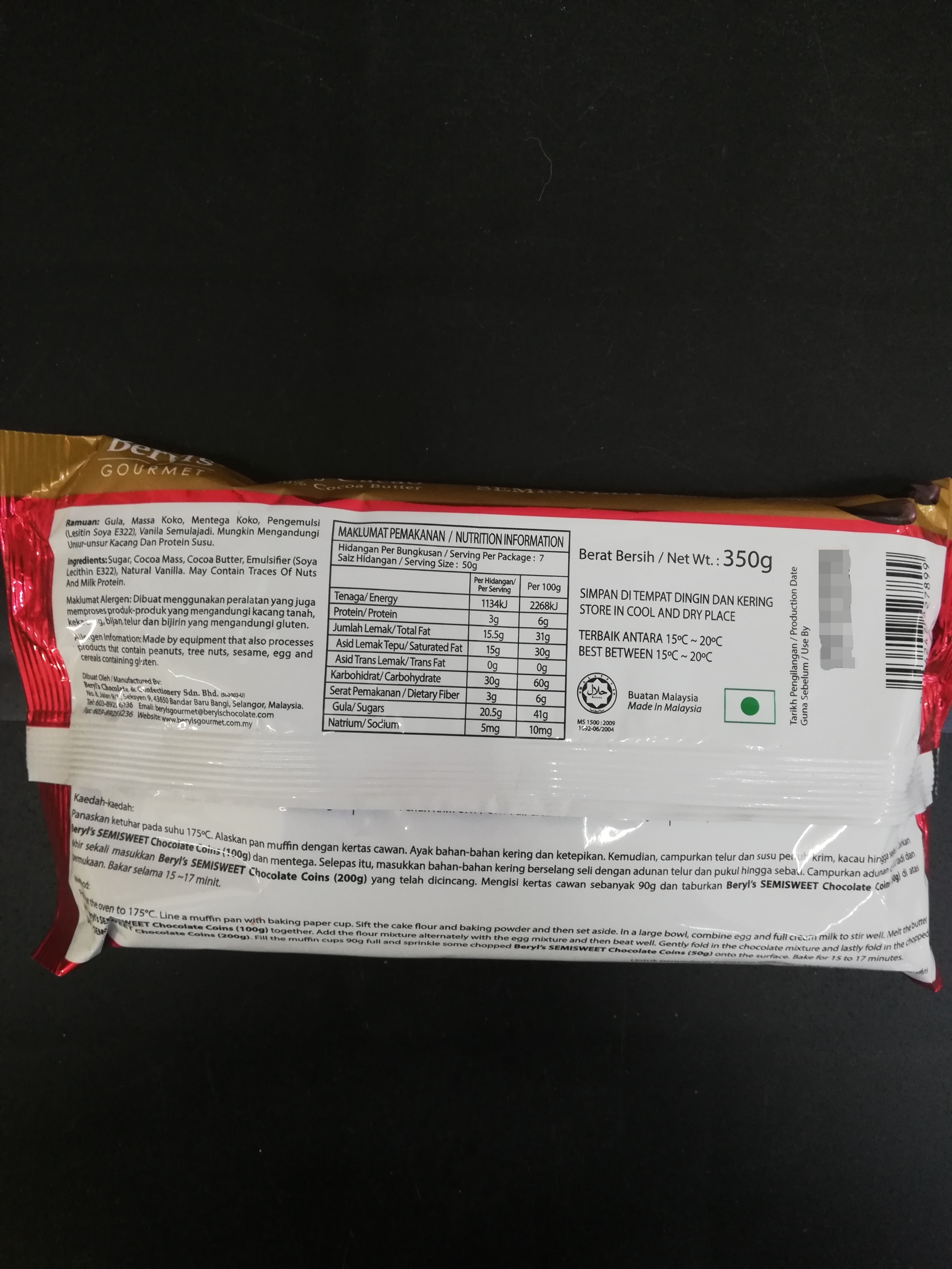 Ingredients: Sugar, Cocoa Mass, Cocoa Butter, Emulsifier (Soya Lecithin E322), Natural Vanilla. May contain traces of nuts and milk protein