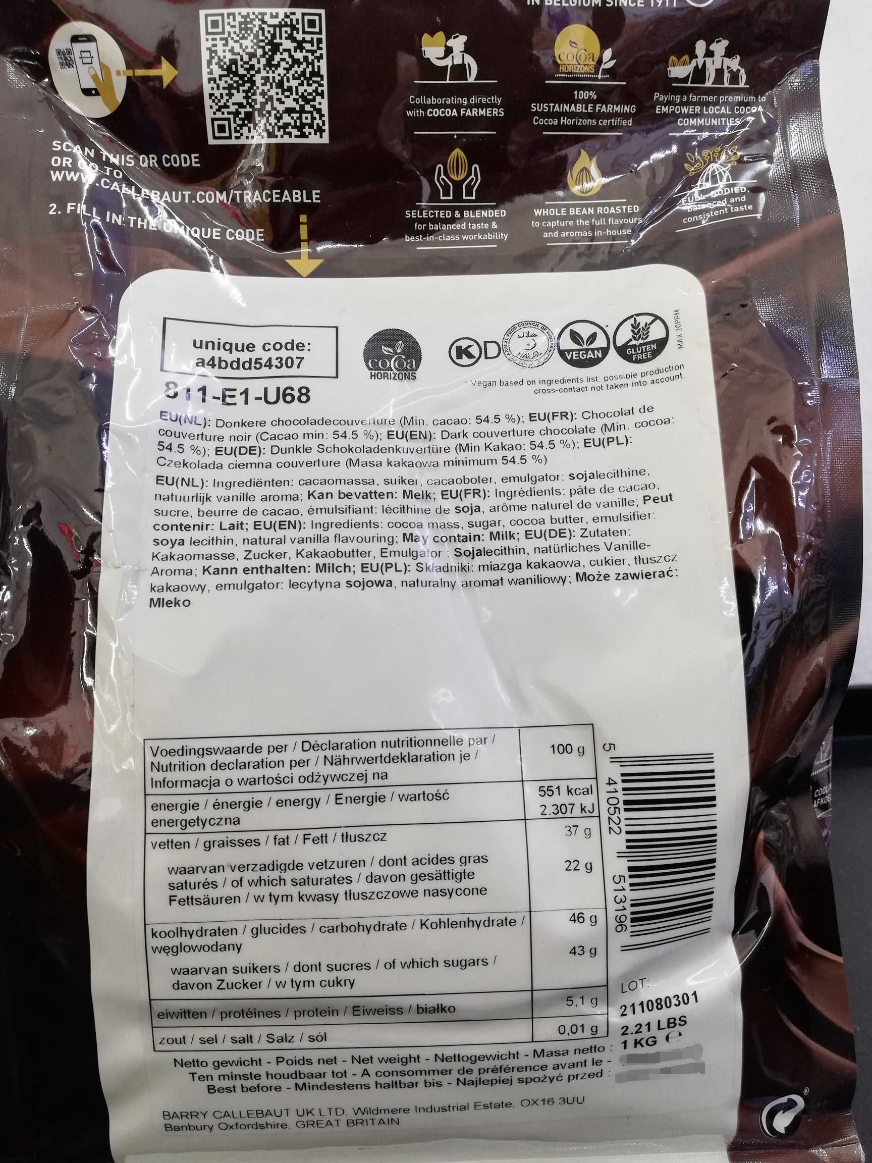 Callebaut 811 Dark Couverture Chocolate 1kg