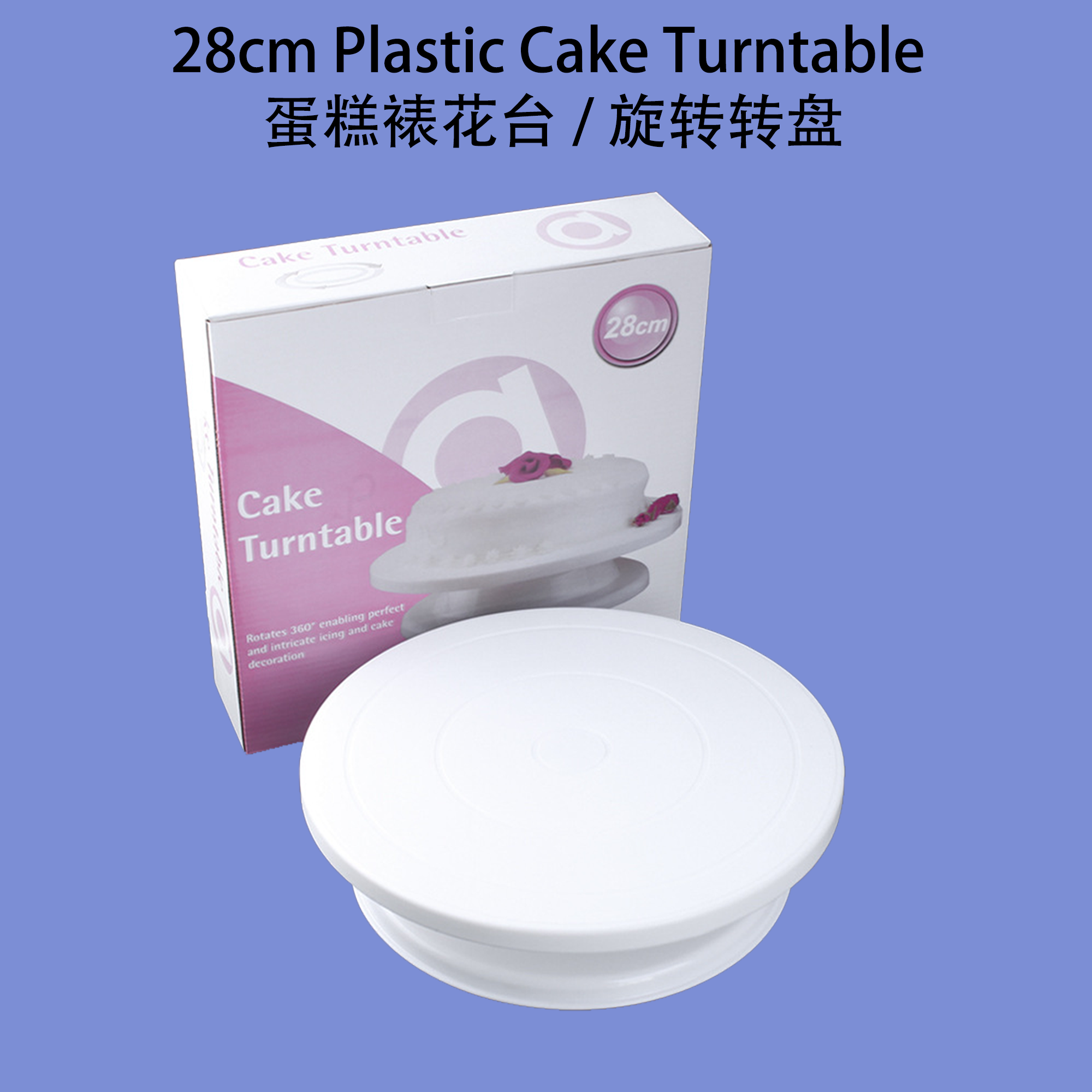 这款塑料蛋糕旋转台适合专业烘焙师和家庭烘焙爱好者,提供稳定顺滑的旋转表面,方便精确轻松地装饰蛋糕。