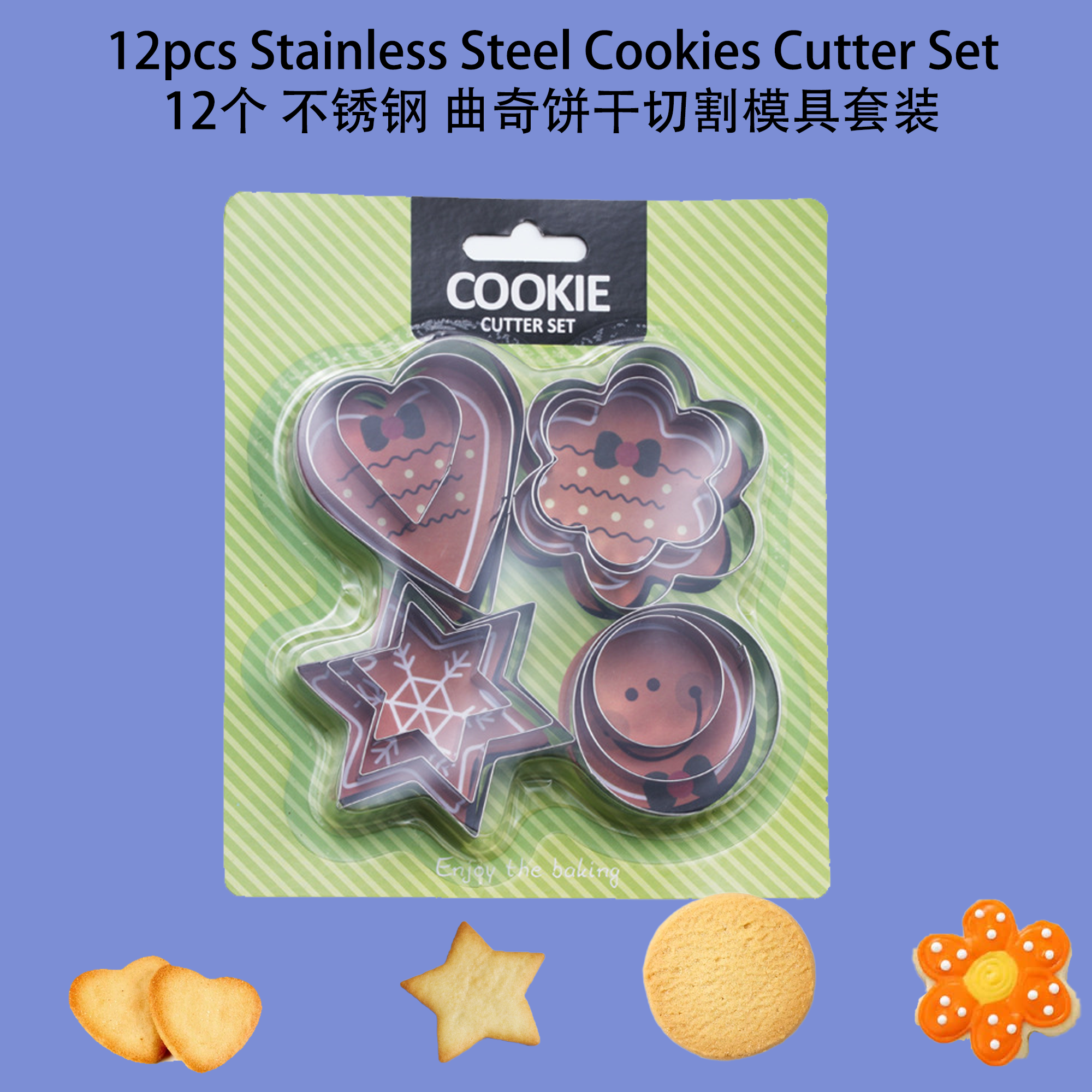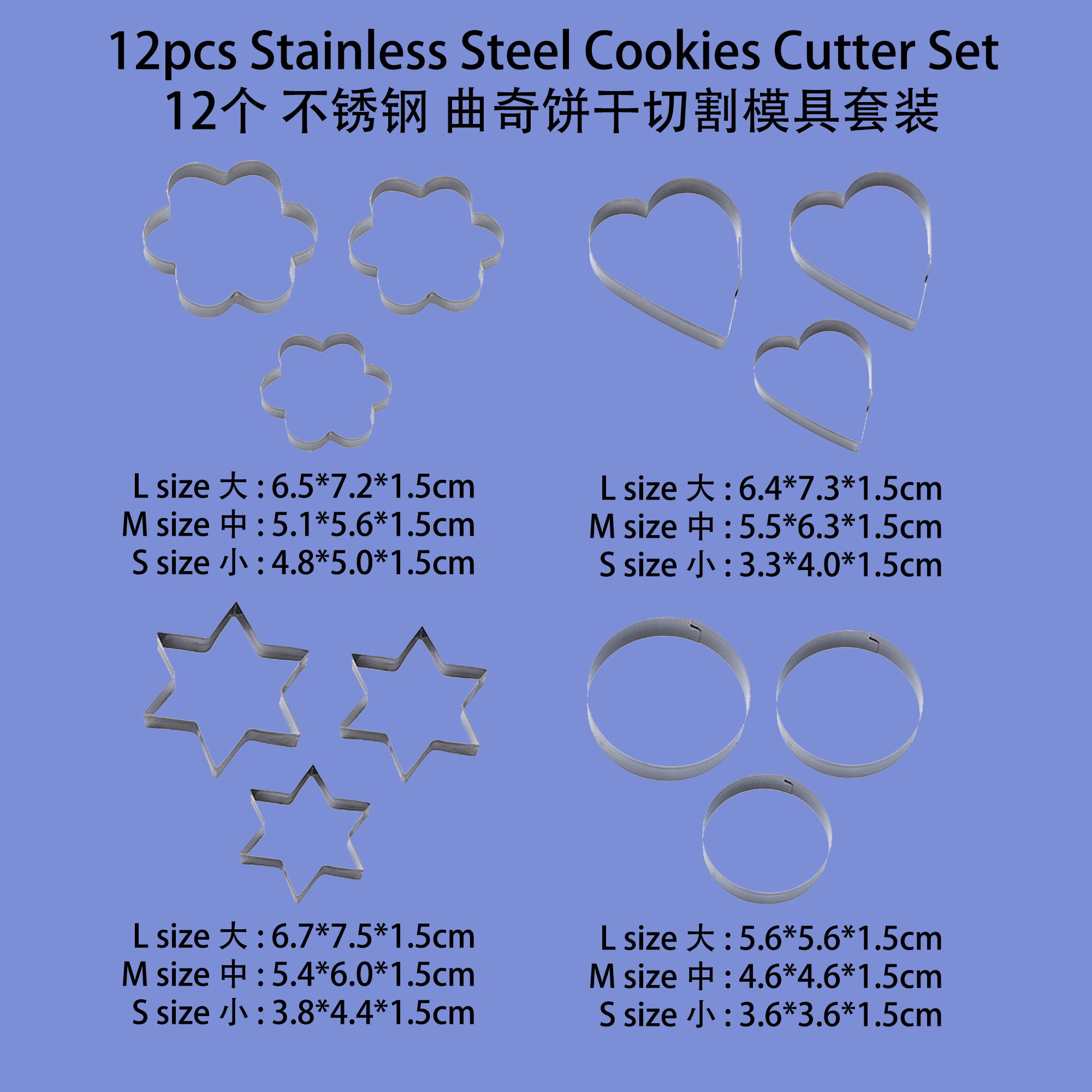 This 12-piece stainless steel cookie cutter set includes a variety of fun shapes, perfect for baking enthusiasts. The cutters come in three different sizes for each shape, making them versatile for any baking project. 这套12个不锈钢曲奇饼干切割模具包含多种有趣的形状,非常适合烘焙爱好者使用。每种形状都有三种不同的尺寸,使其在任何烘焙项目中都非常实用。