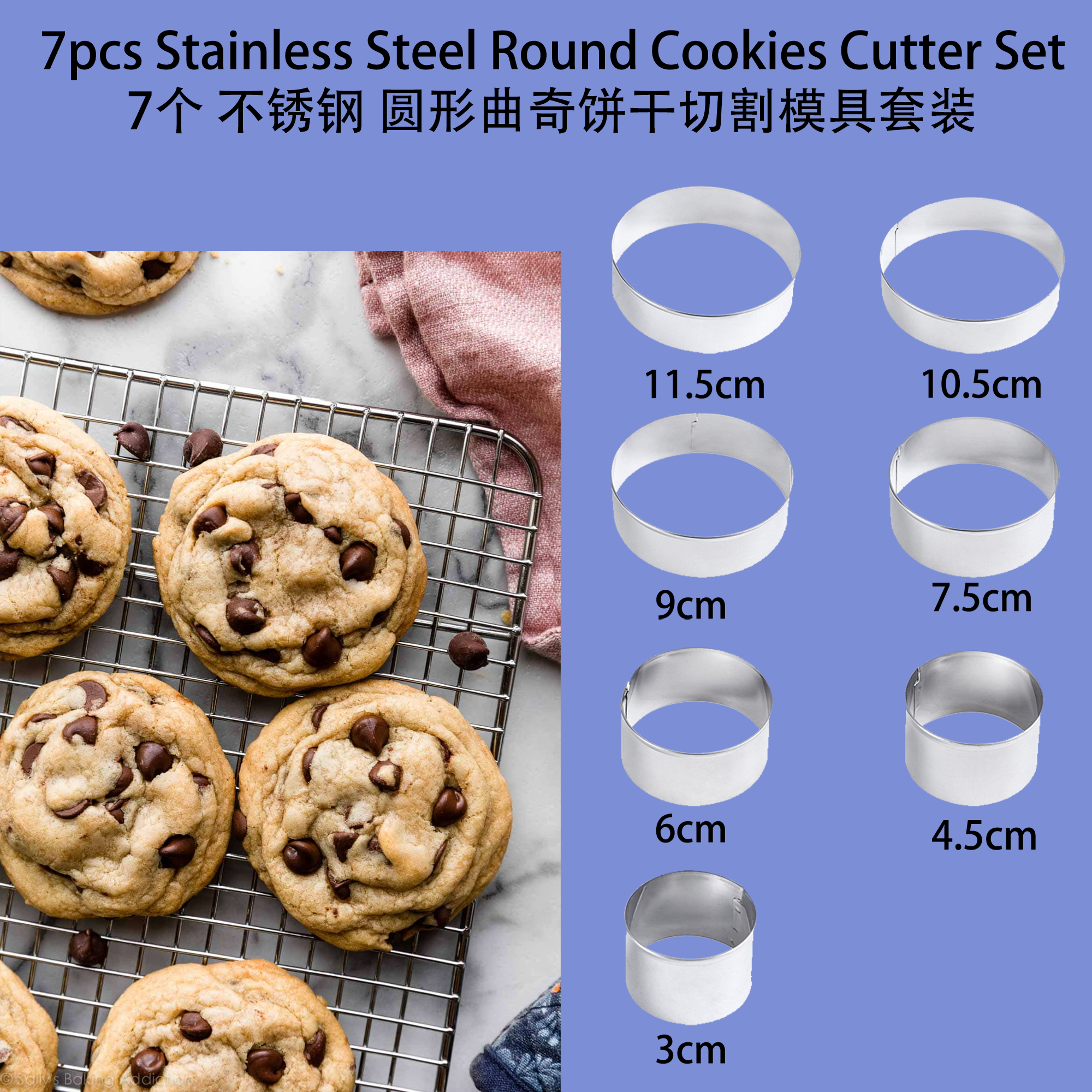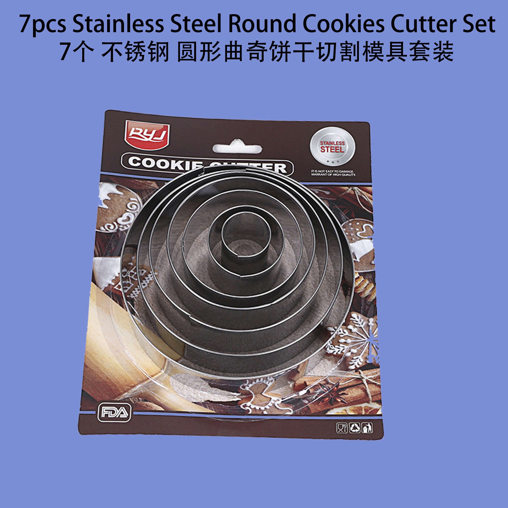 This 7-piece stainless steel round cookie cutter set is ideal for creating perfectly shaped cookies, biscuits, and fondant decorations. The set includes cutters in various sizes to suit your baking needs 这套7个不锈钢圆形曲奇饼干切割模具非常适合制作形状完美的曲奇饼干、饼干和糖霜装饰。该套装包含各种尺寸的模具,以满足您的烘焙需求: