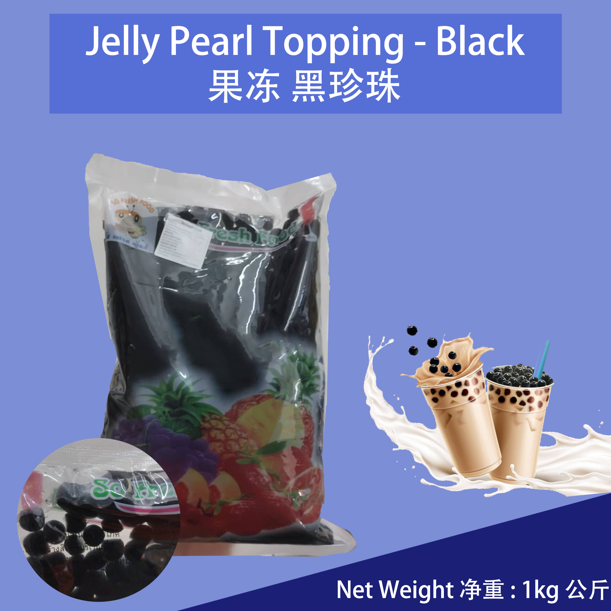 Add a splash of color and a burst of fun to your desserts and milk teas with these black color jelly pearls. Perfect for topping boba drinks, milk tea, or any sweet treats, these small, round pearls do not require cooking. 为您的甜点和奶茶增添一抹色彩和乐趣,这些黑色果冻珍珠是装饰饮品、奶茶或任何甜点的完美选择。这些小巧圆形的珍珠不需要烹饪