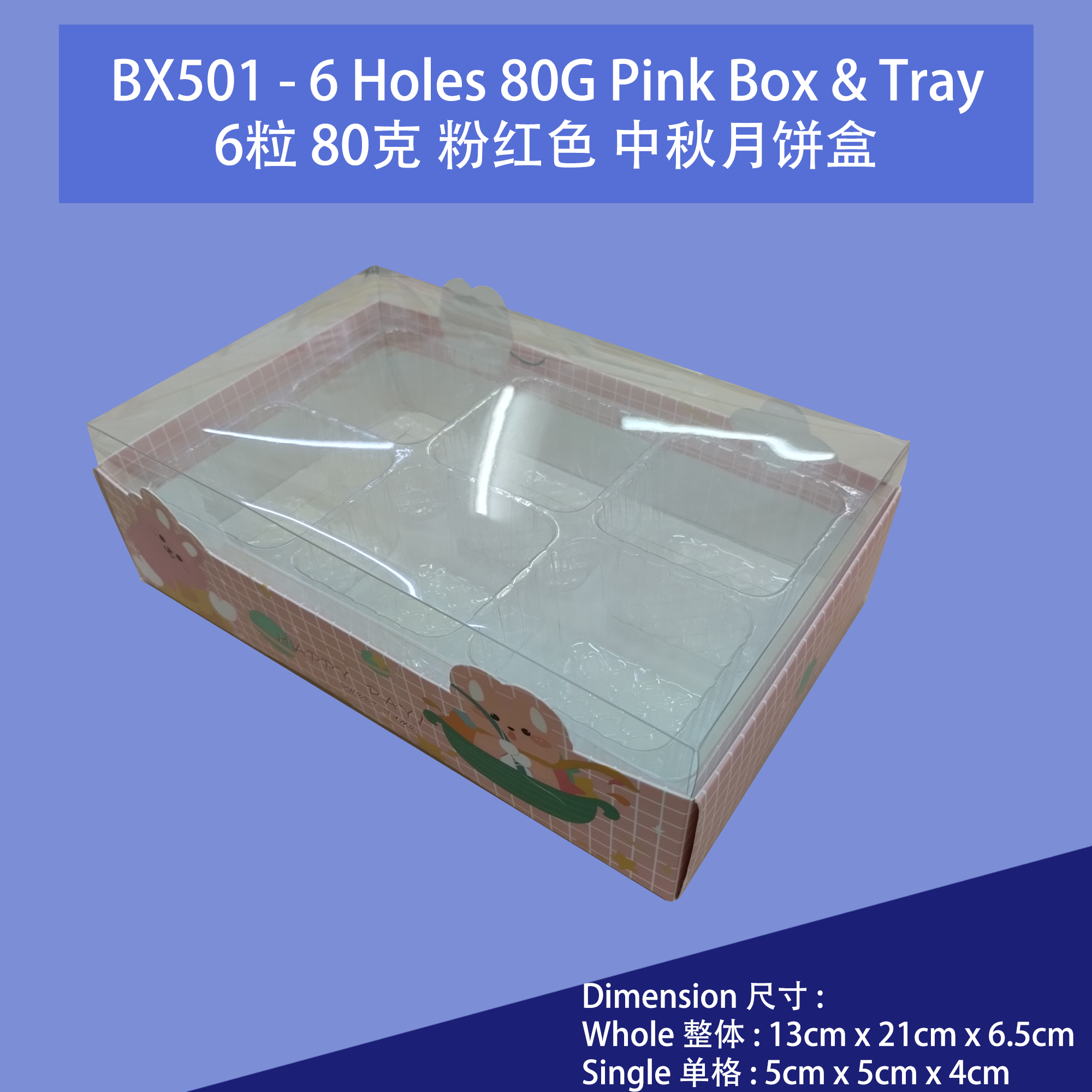 Product Name 产品名称 : 6 Cavity 80g Pink Transparent Box - BX501 6粒装80克粉红色透明月饼礼盒