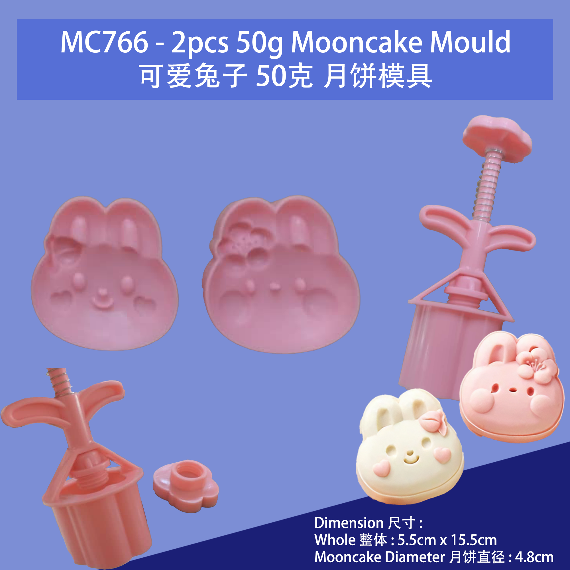 Product Name / 产品名称: MC766 - 2pcs 50g Fu Rabbit Mooncake Plunger Mould 2片50克 可爱小兔子 传统按压式月饼模具