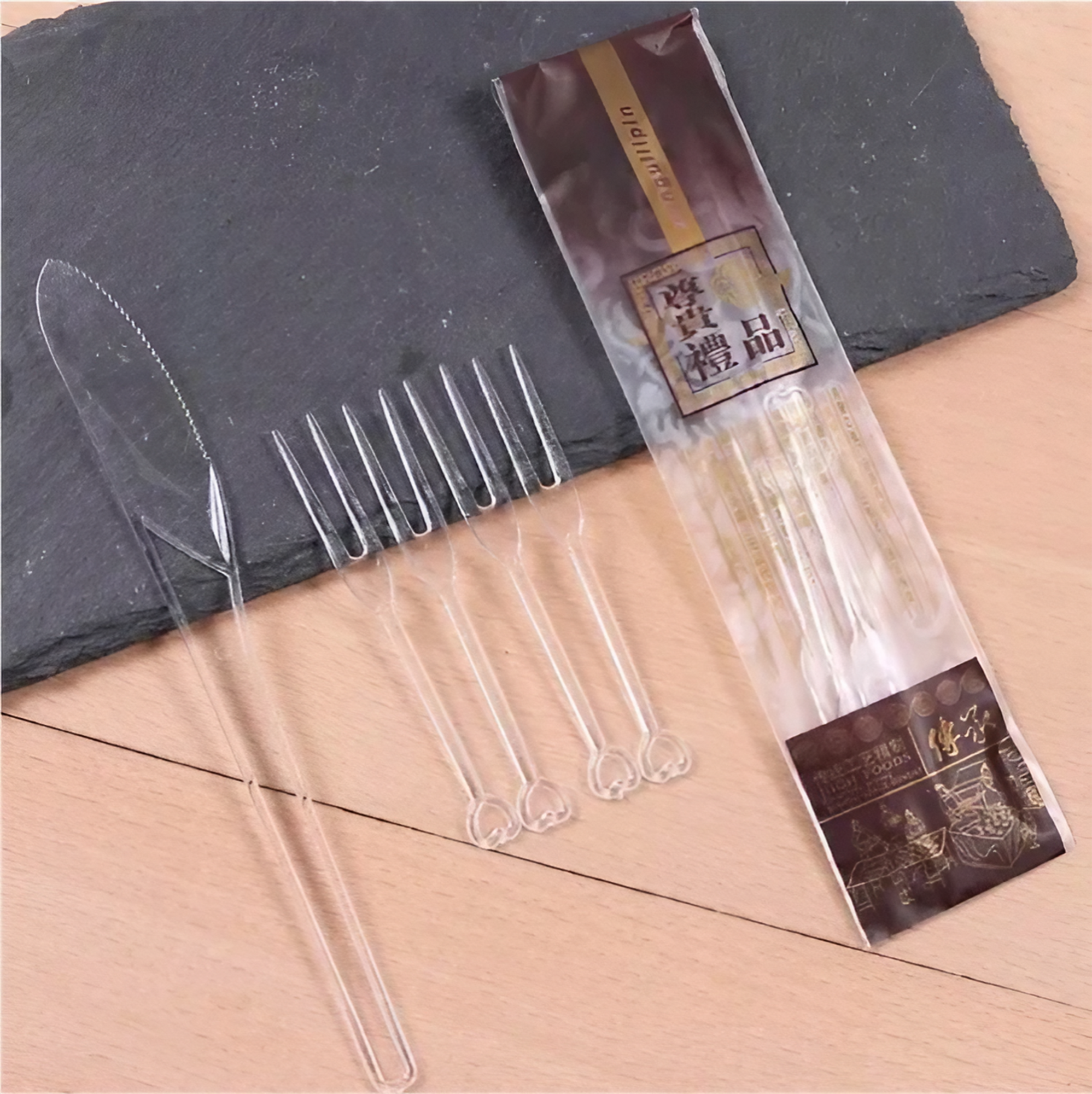 Description 描述 : Each set contains four forks and one knife, perfect for serving mooncakes. The set is practical and convenient for festive occasions or daily use. 每套包含四把叉子和一把刀,非常适合盛放月饼。该套装实用且方便,适合节日场合或日常使用。