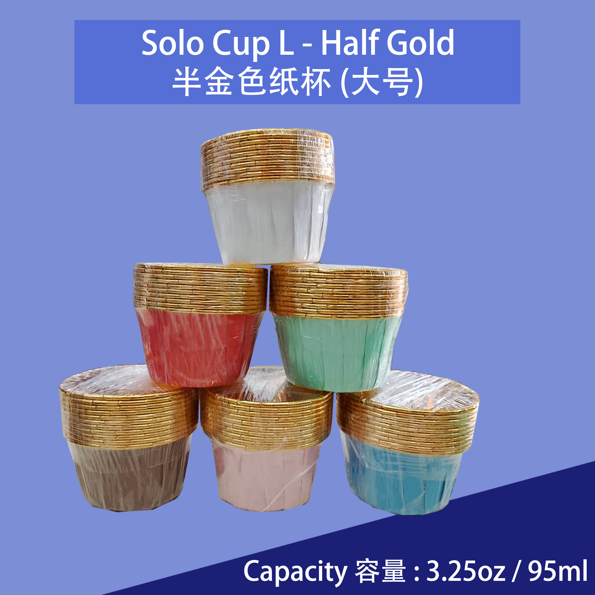 These Solo Cup L - Half Gold are elegant paper cups perfect for various dessert and baking needs. The cups have a stylish design featuring a glossy half-gold finish on the inner, paired with different vibrant colors on the outer, making them ideal for special occasions such as weddings, birthdays, or festive gatherings. With a 3.25 oz (95 ml) capacity, they are ideal for serving cupcakes, muffins, or small desserts. 这个半金纸杯非常适合各种甜点和烘焙需求。这些杯子采用时尚的设计,内部有光泽的半金色饰面、,外部搭配不同的鲜艳颜色,非常适合婚礼、生日或节日聚会等特殊场合。它们的容量为 3.25 盎司(95 毫升),非常适合盛放纸杯蛋糕、松饼或小甜点。