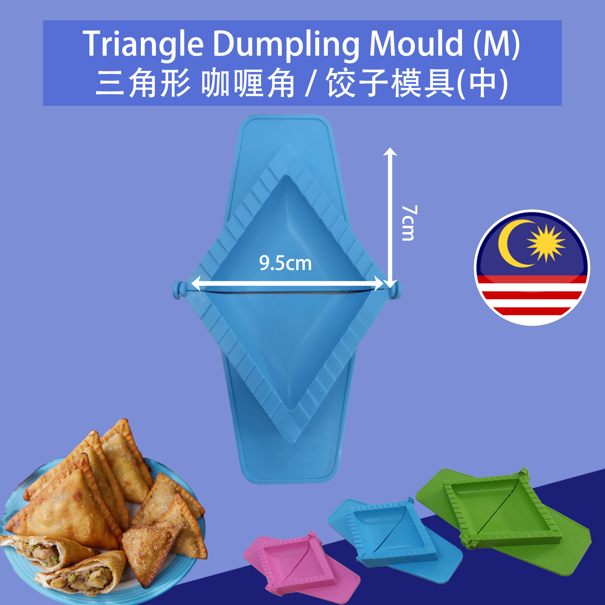 Product Name / 产品名称: Triangle Curry Puff / Chinese Dumpling Plastic Mould 三角形咖喱饺/馄饨饺子塑料模具 Size 尺寸 : M 中 - 9.5cm (Width 宽度) x 14cm (Length 长度)