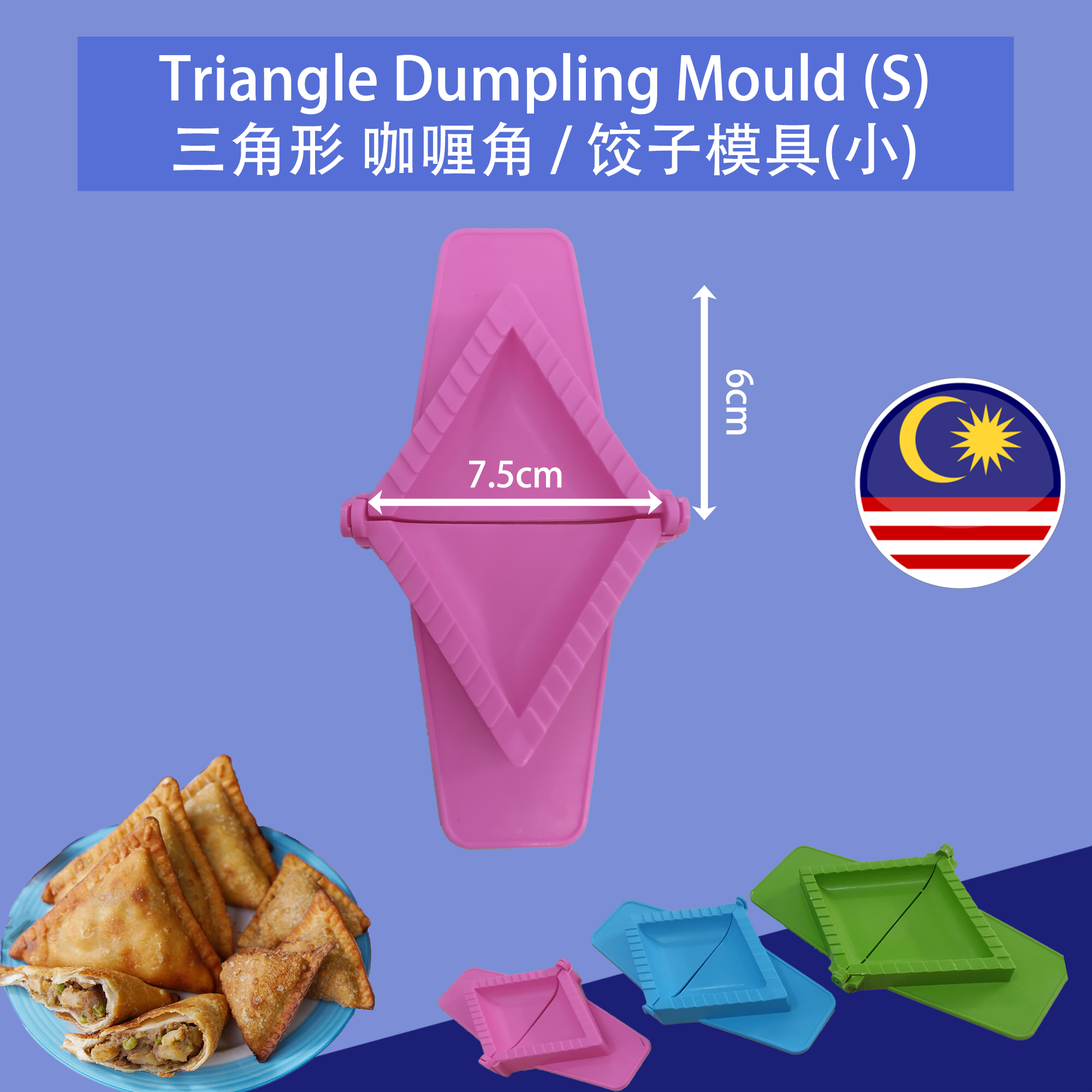 Product Name / 产品名称: Triangle Curry Puff / Chinese Dumpling Plastic Mould 三角形咖喱饺/馄饨饺子塑料模具 Size 尺寸 : S 小 - 7.5cm (Width 宽度) x 12cm (Length 长度)