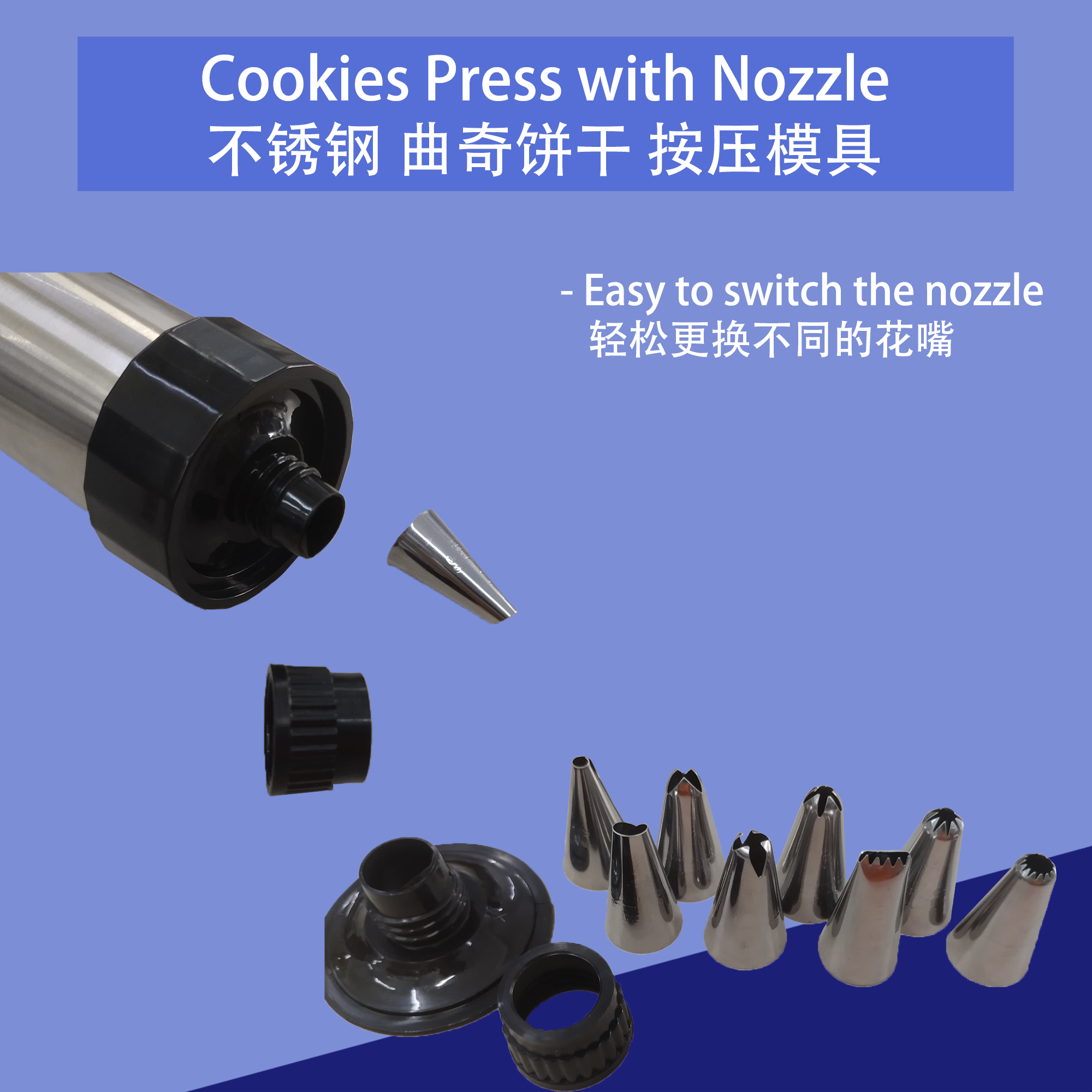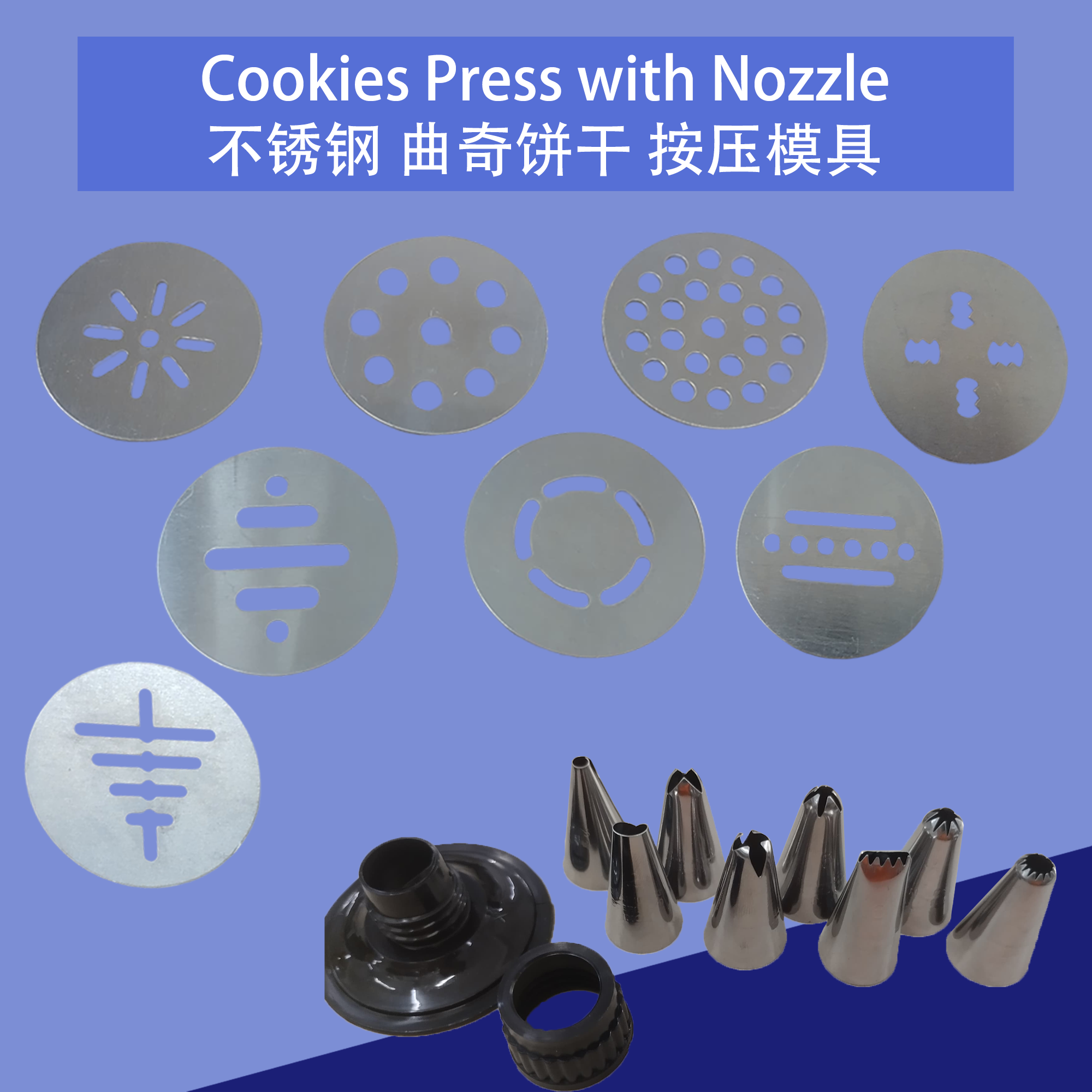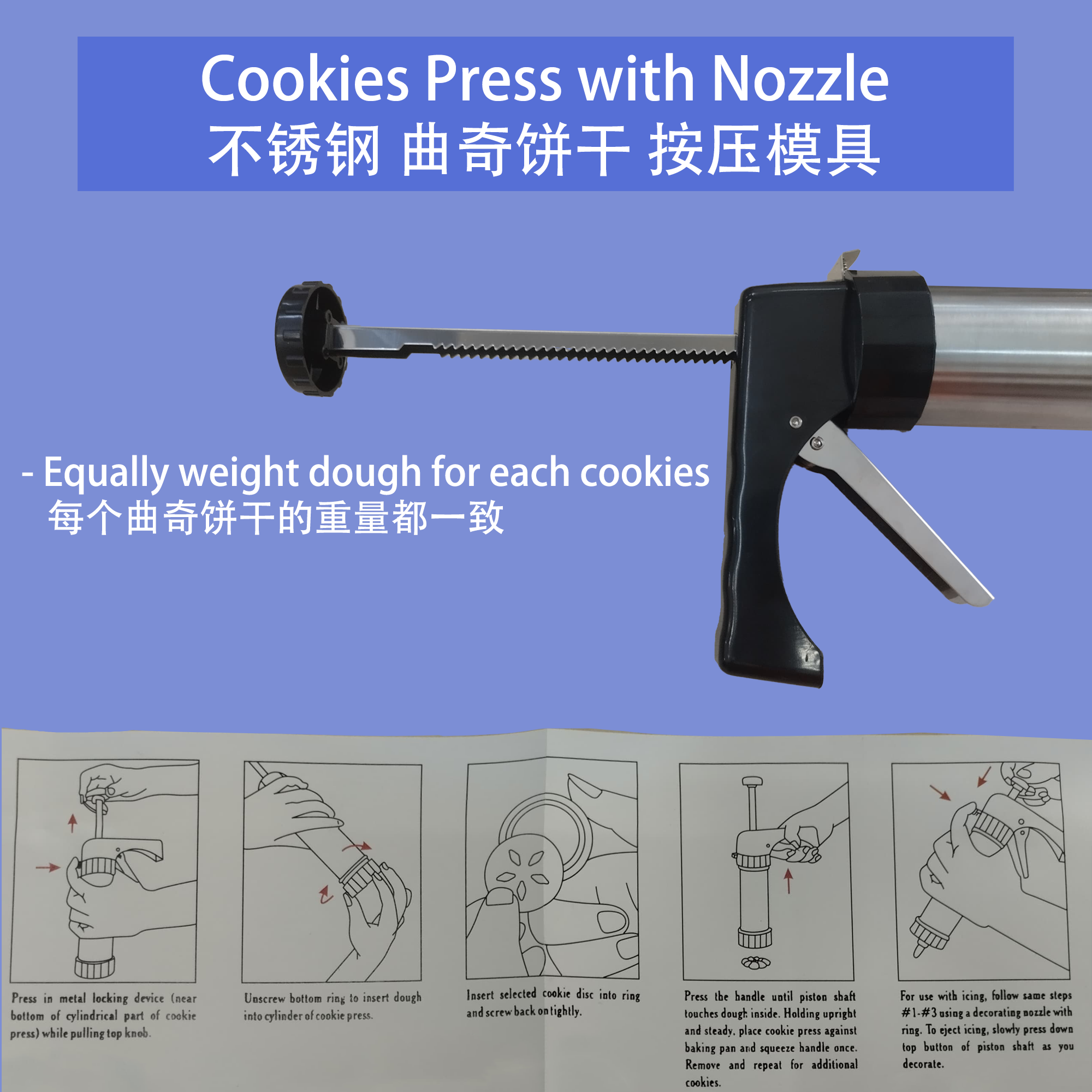 Product Name / 产品名称: S/S Cookies Press with Nozzle 按压式 曲奇饼干 模具 Dimension 尺寸 : 21.5cm x 14cm x 6cm Nozzle 花嘴 : Fit for 1.8cm diameter size 适用于1.8cm直径的花嘴 Flower Plate 花片 : 5cm diameter 直径 Packaging contain 包装内有 : Press pump 按压泵x 1 , Muruku Plate 花片x 8 , Nozzle 花嘴x 8