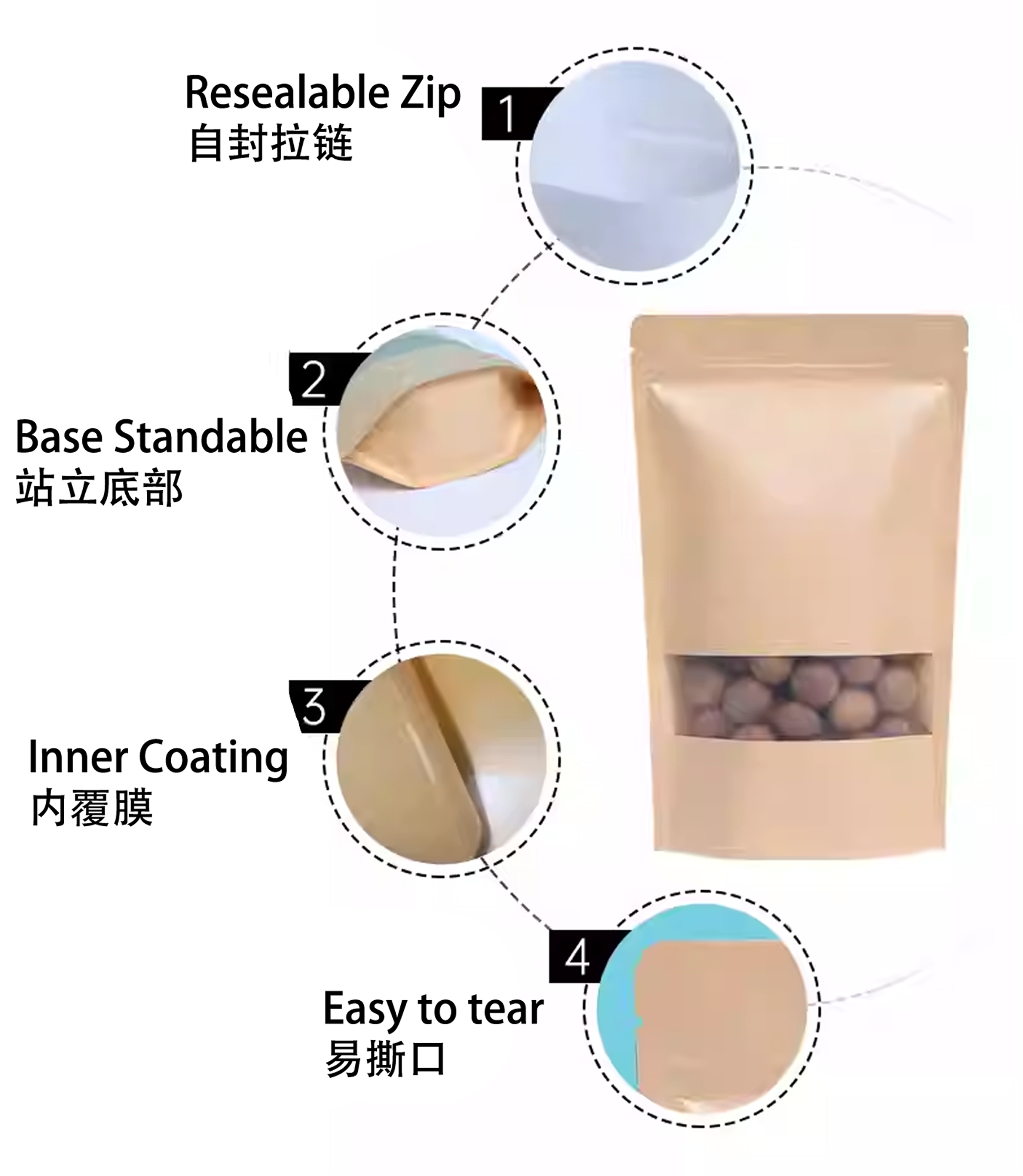 • Resealable Zip 自封拉链 : Equipped with a ziplock seal to keep contents fresh and prevent spillage 配有自封拉链,保持袋内物品新鲜并防止洒漏